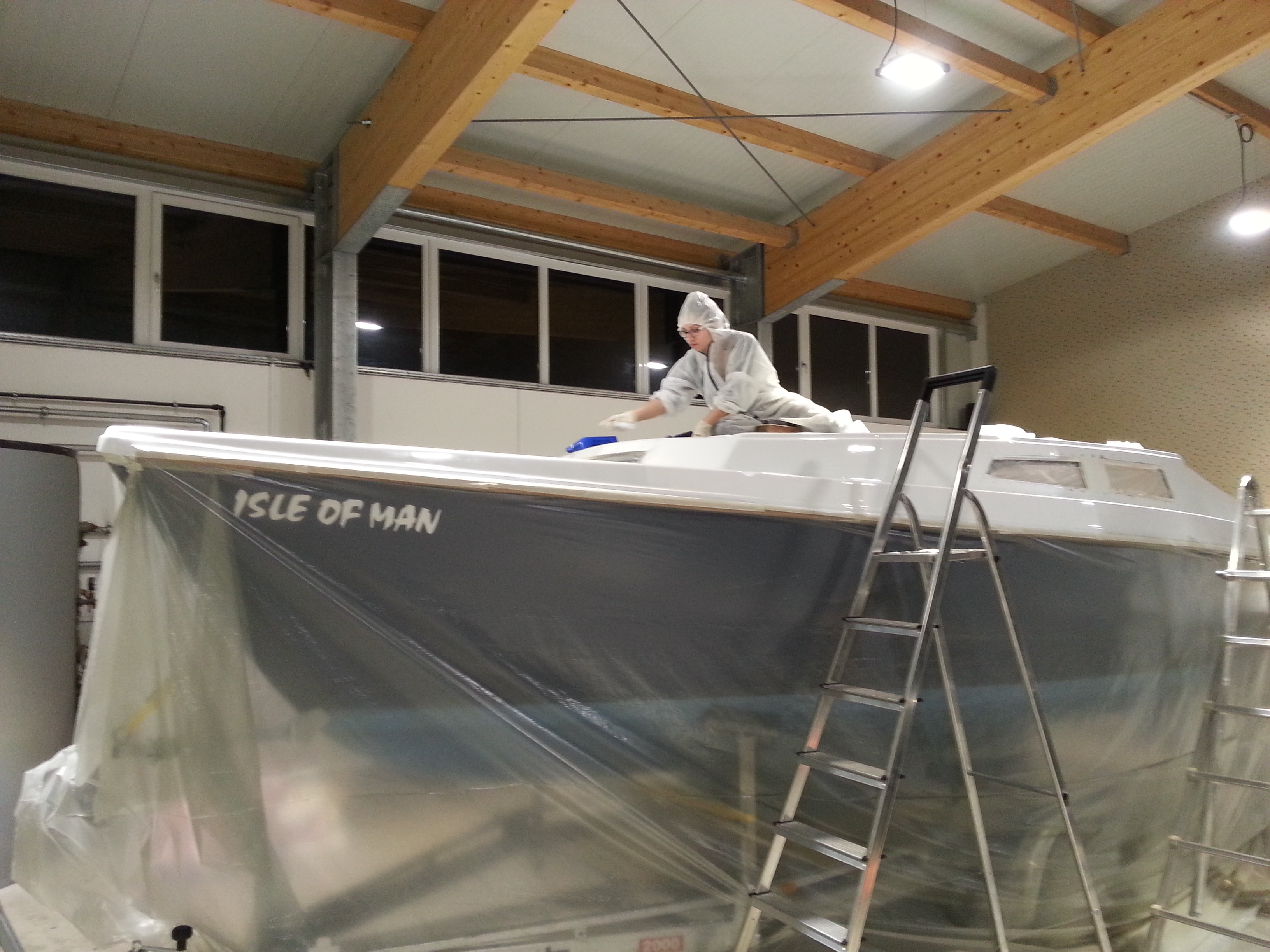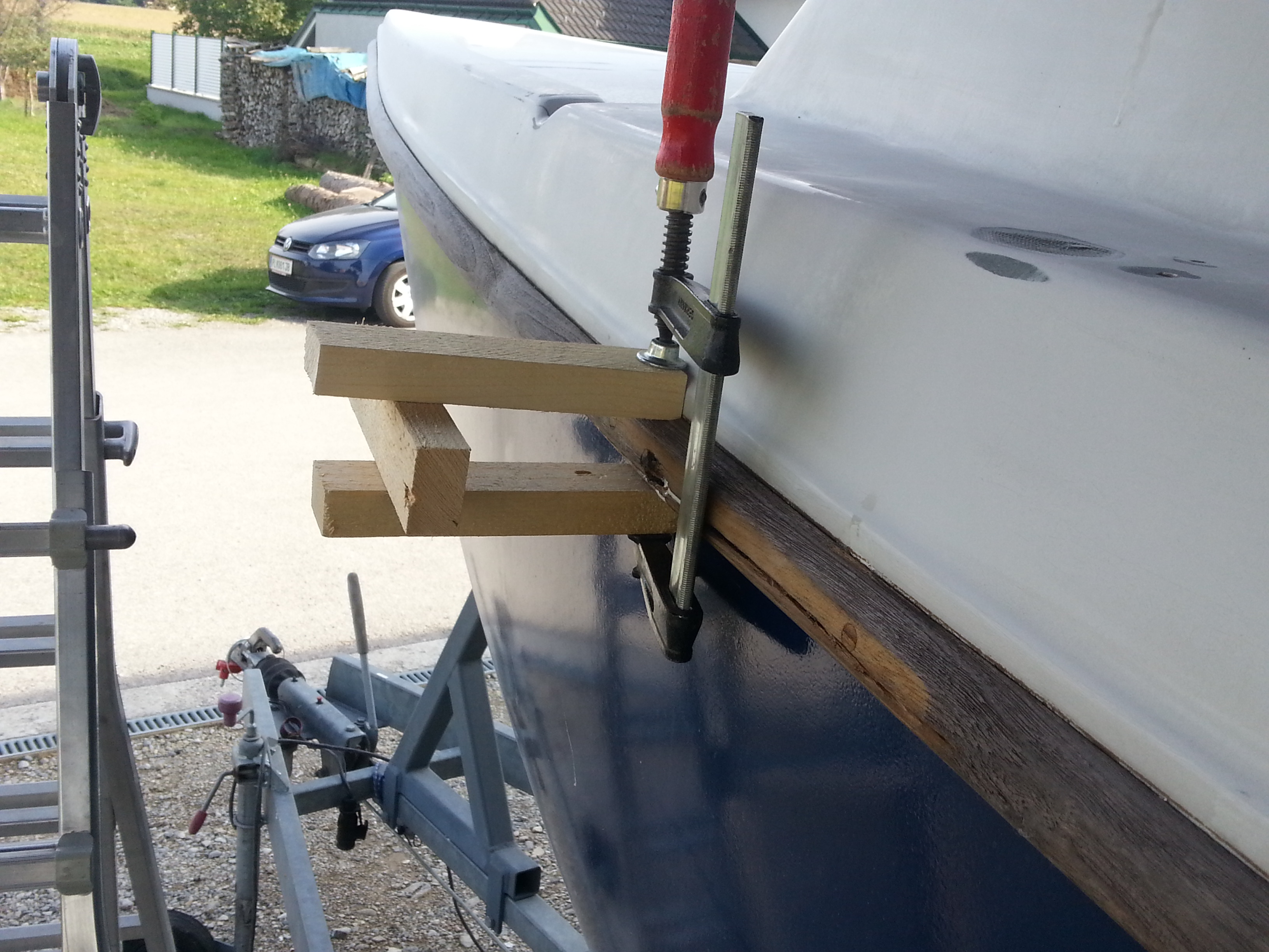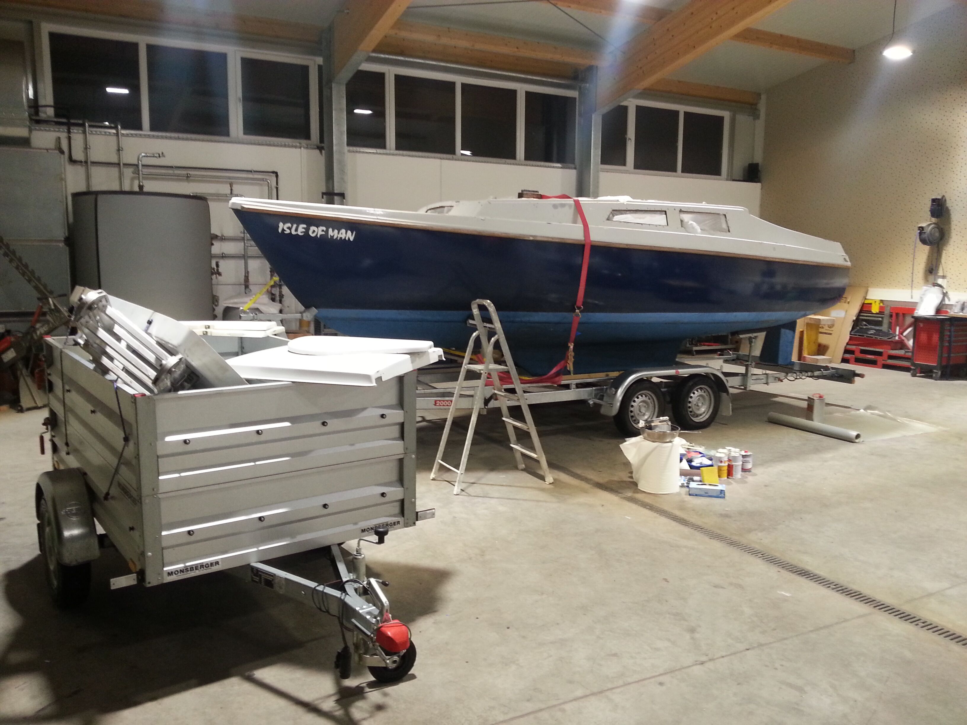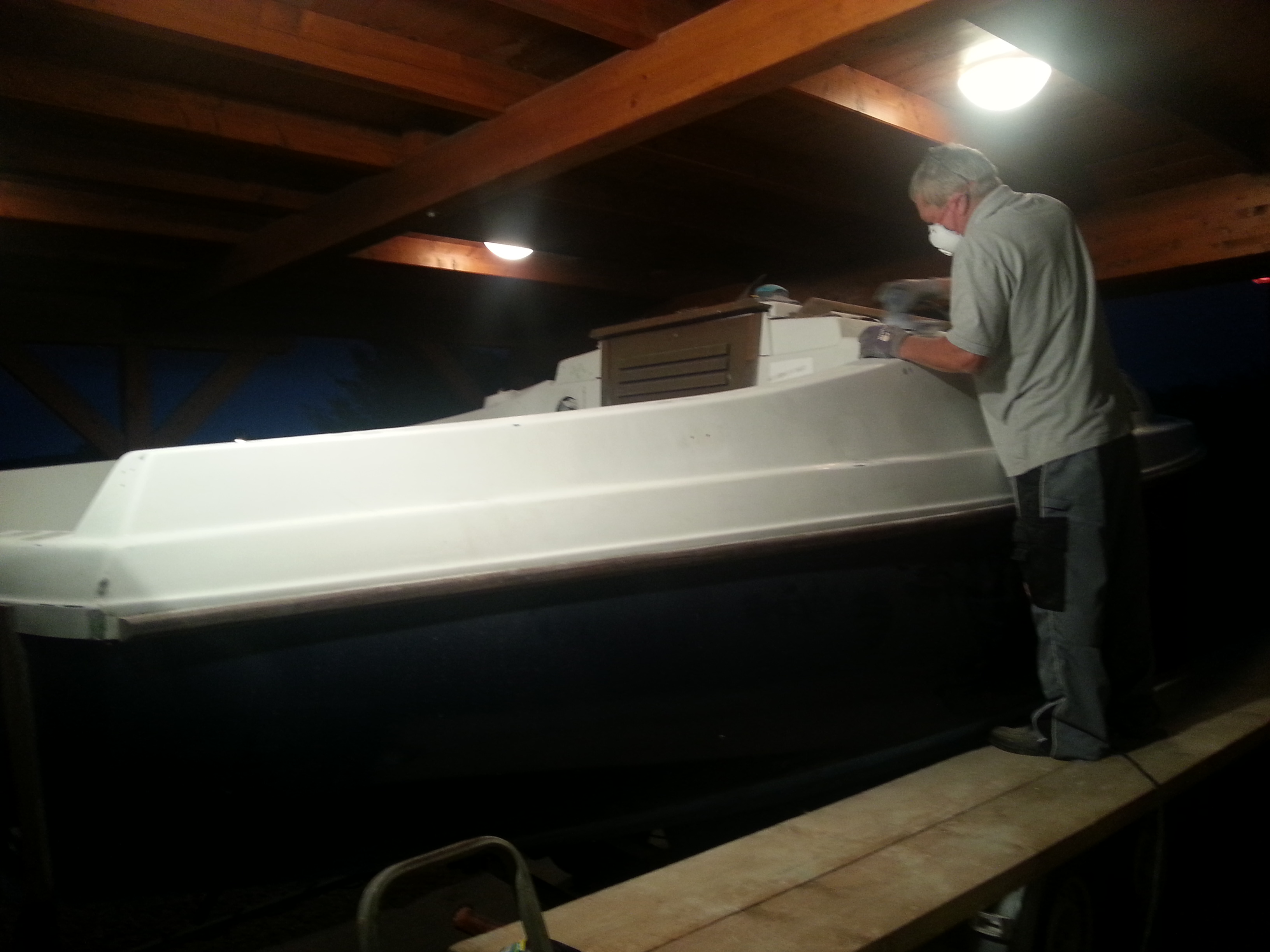 Nachdem wir uns in einem nahegelegenen Hafen um einen Trailer umgesehen haben, ging es dann wieder weiter an die Arbeit. Ich habe die gesamte linke Scheuerleiste fertig mit Holzspachtel repariert und ebenfalls geschliffen. Das muss natürlich sein bevor das erste mal lackiert wird – da ein schleifen im nachhinein den Lack ev. beschädigen würde.