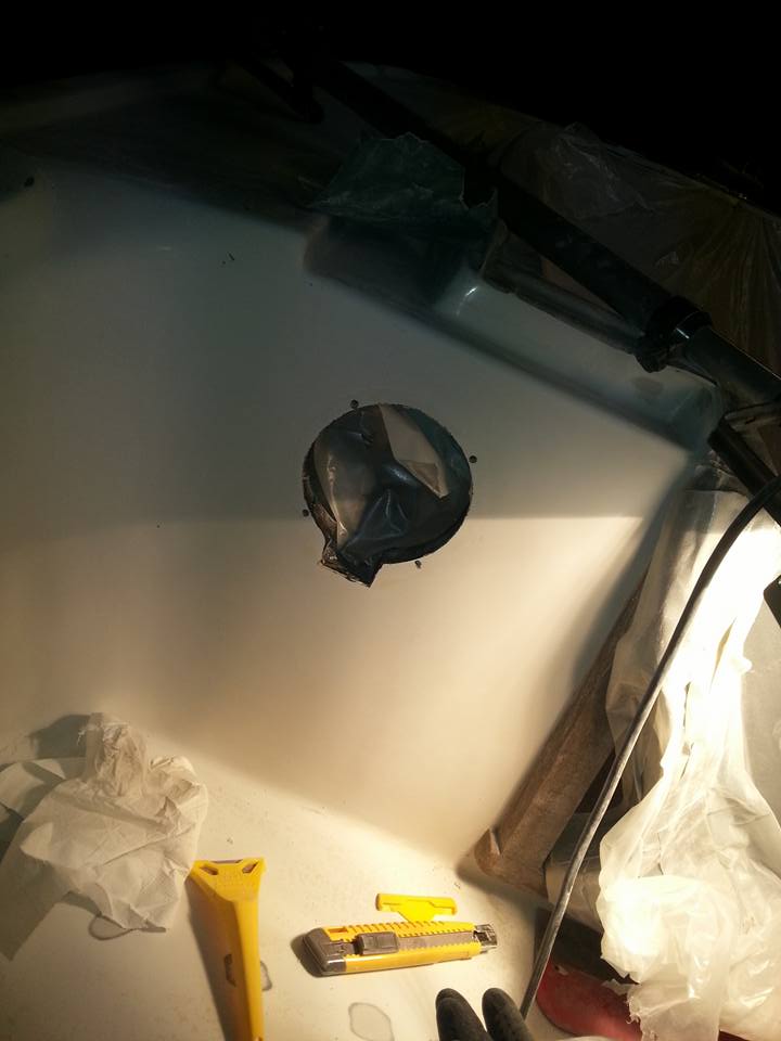 Motorschachtdeckel Innenlaminat wurde geschliffen und begutachtet, die restlichen Schäden wurden aufgeflext, alles entfettet und dann mit Epoxy+Glasfilament wieder ausgebessert