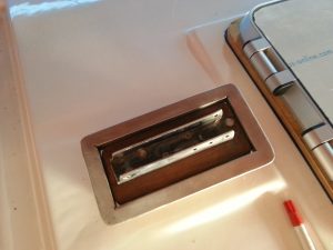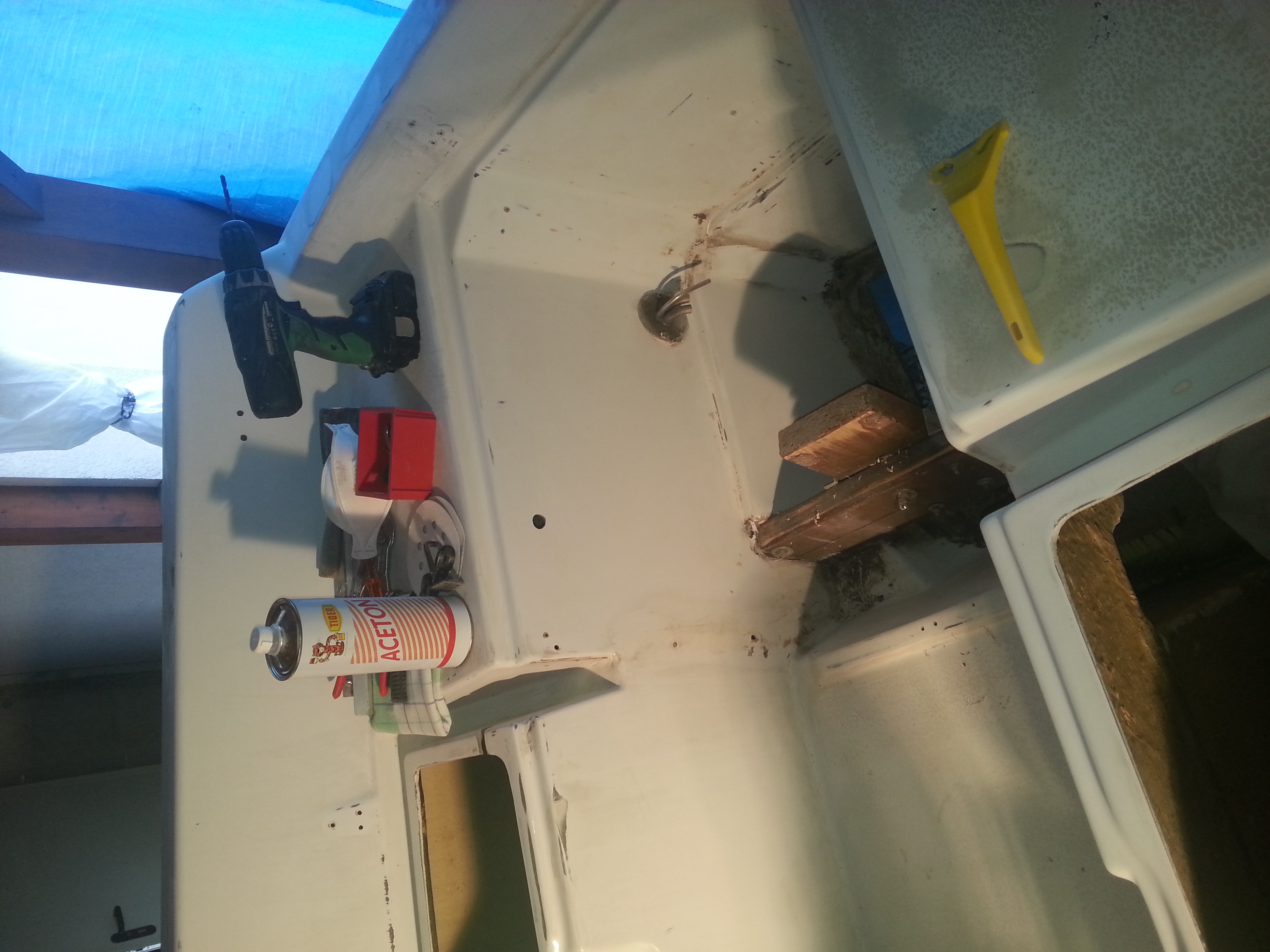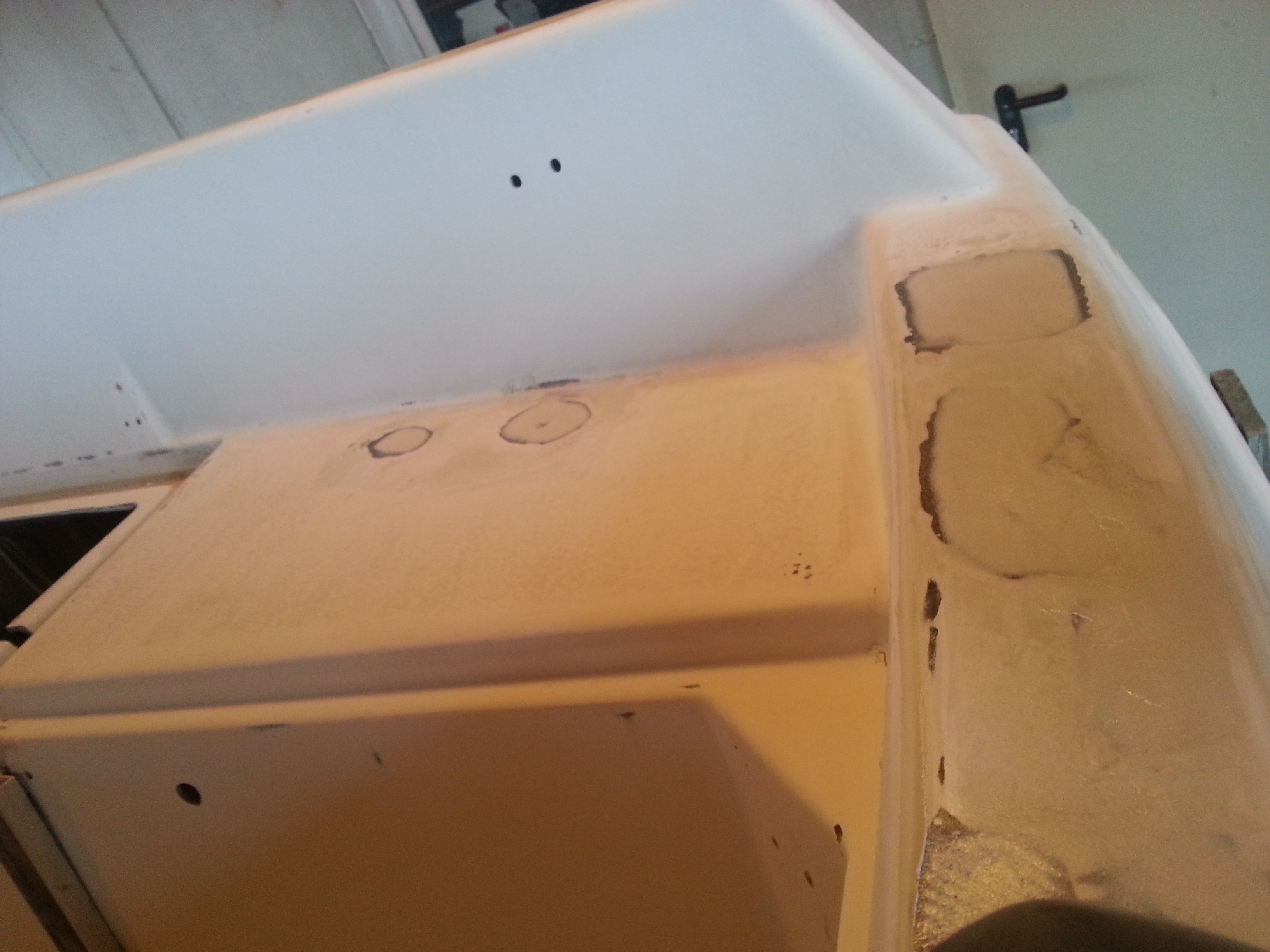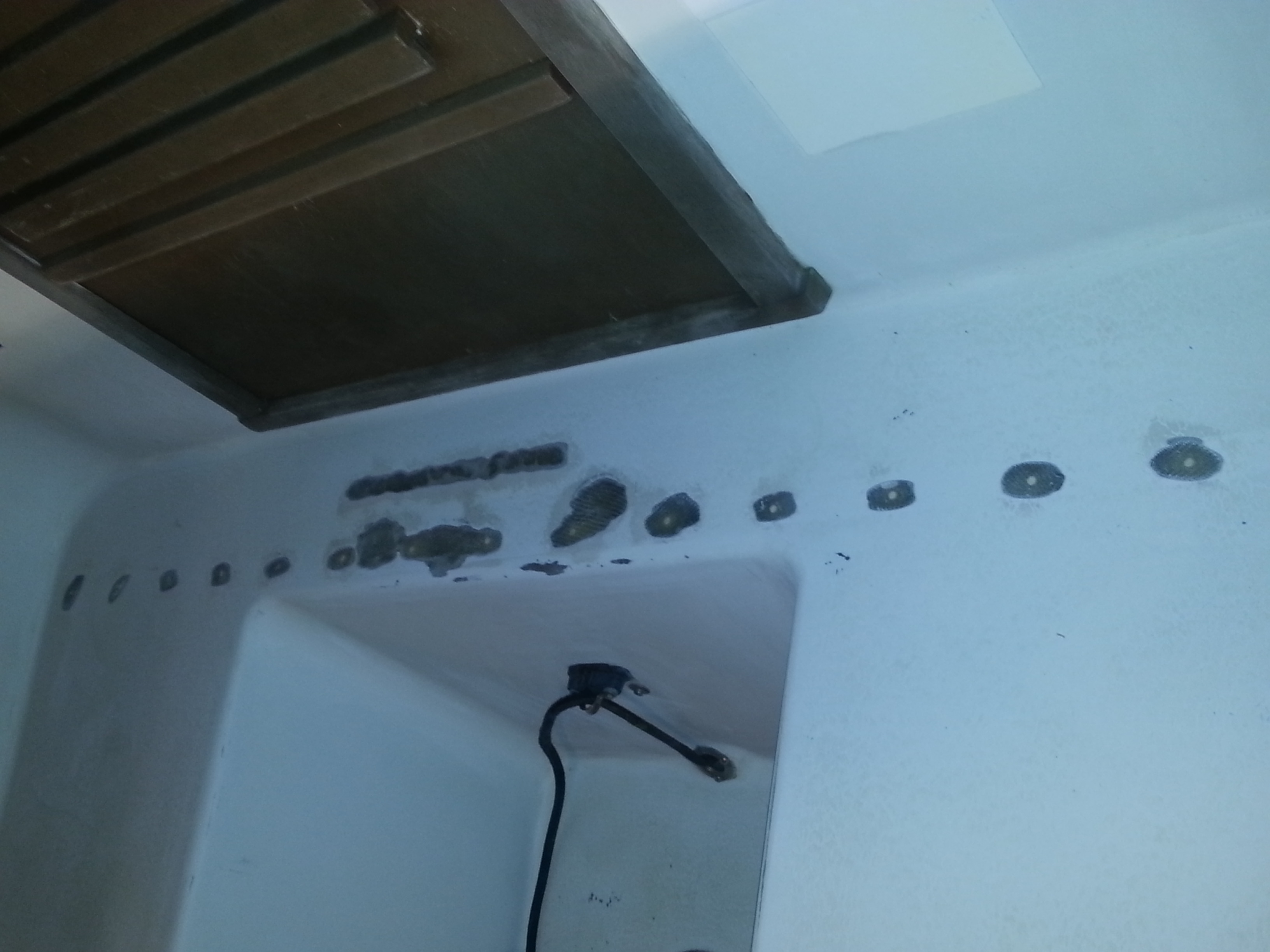Beschläge, Püttinge demontiert, Risse entdeckt (Pütting li. mitte), GFK-Blasen im linken Fach unten entdeckt