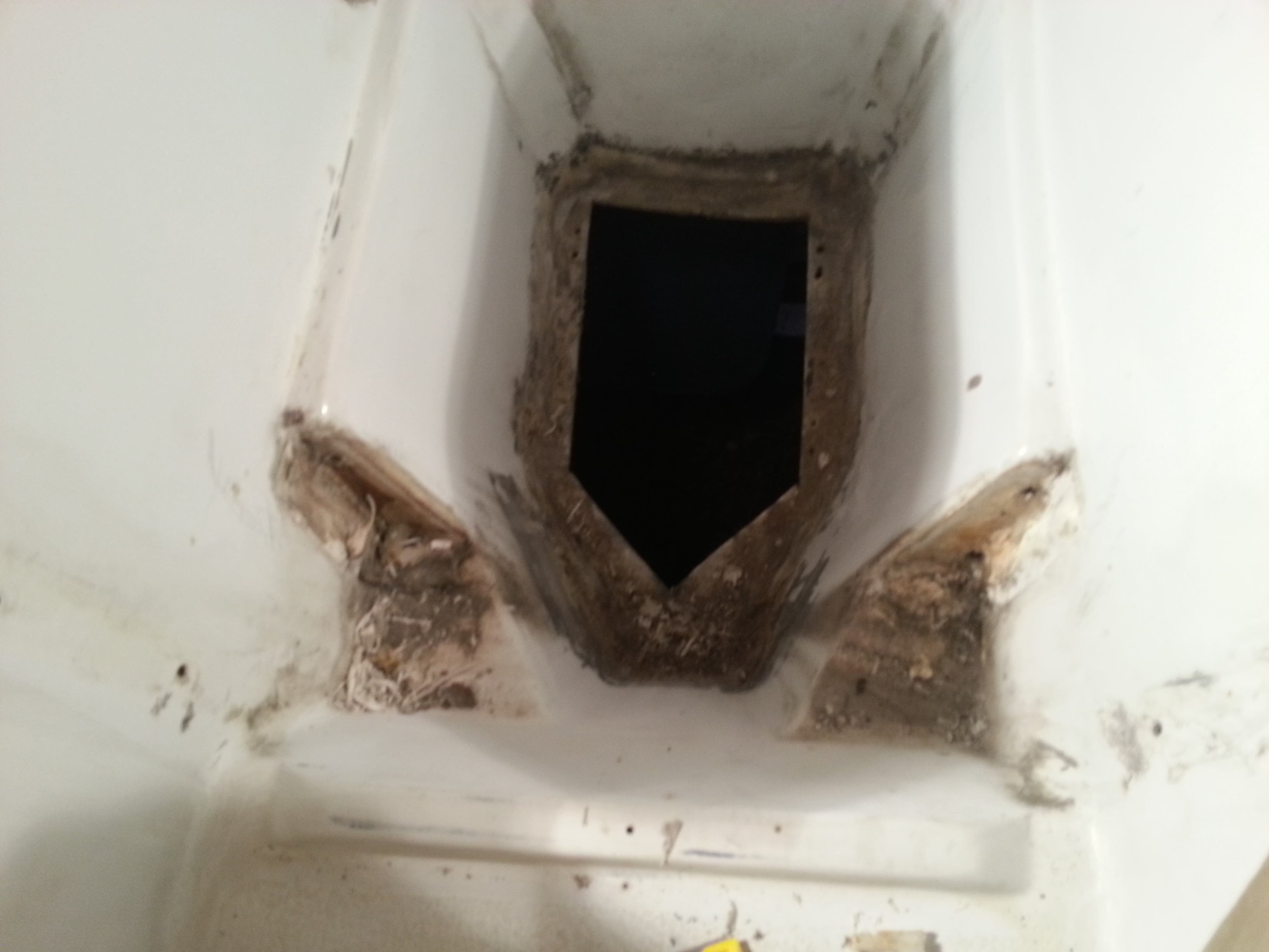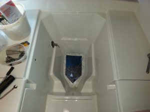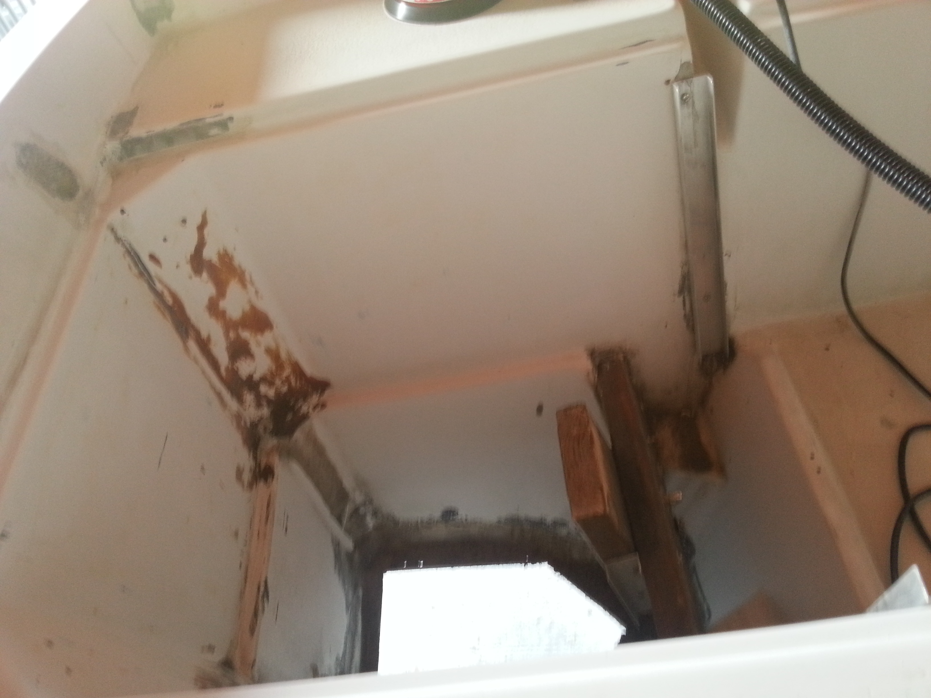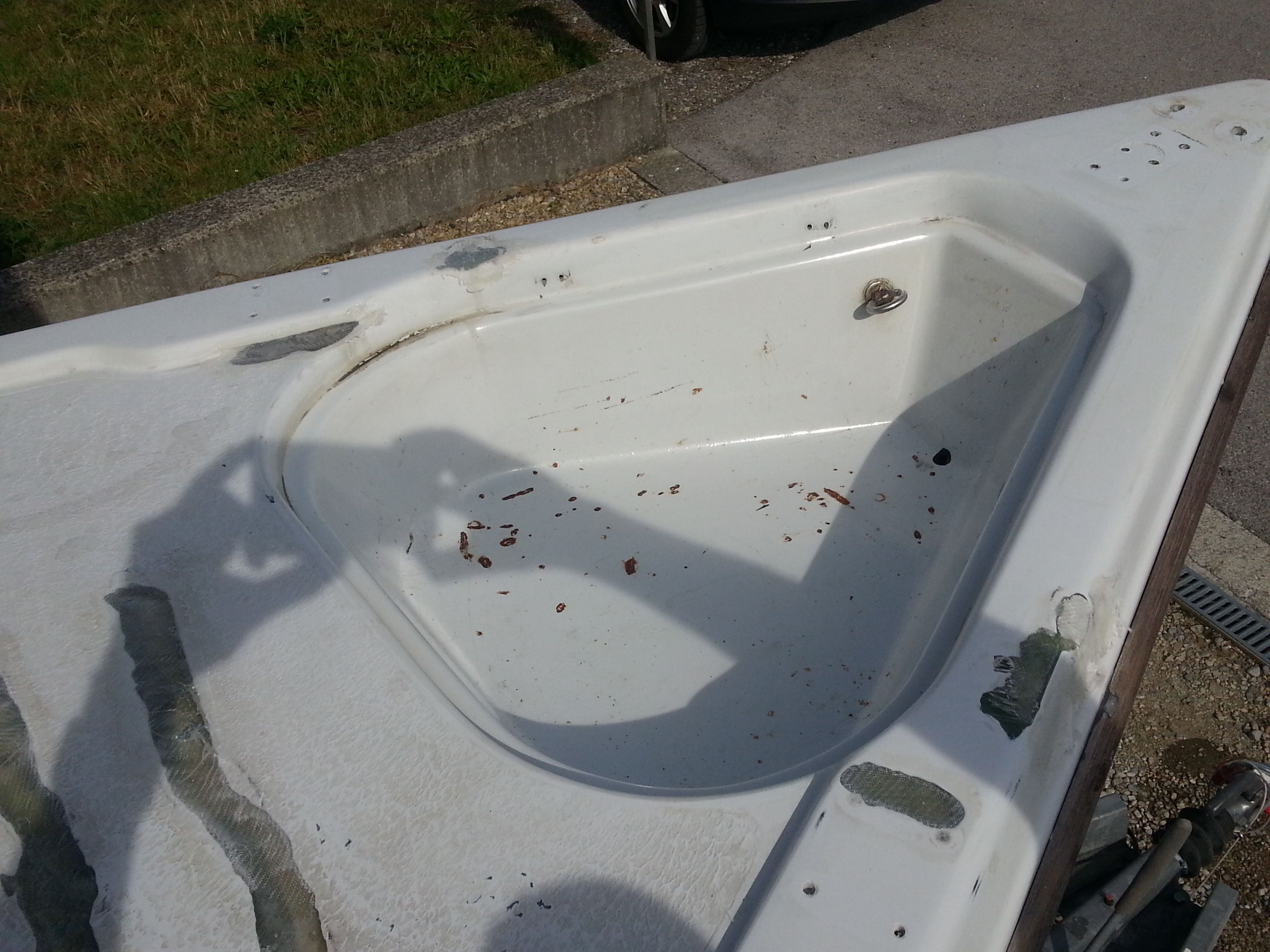 Beschläge, Püttinge demontiert, Risse entdeckt (Pütting li. mitte), GFK-Blasen im linken Fach unten entdeckt