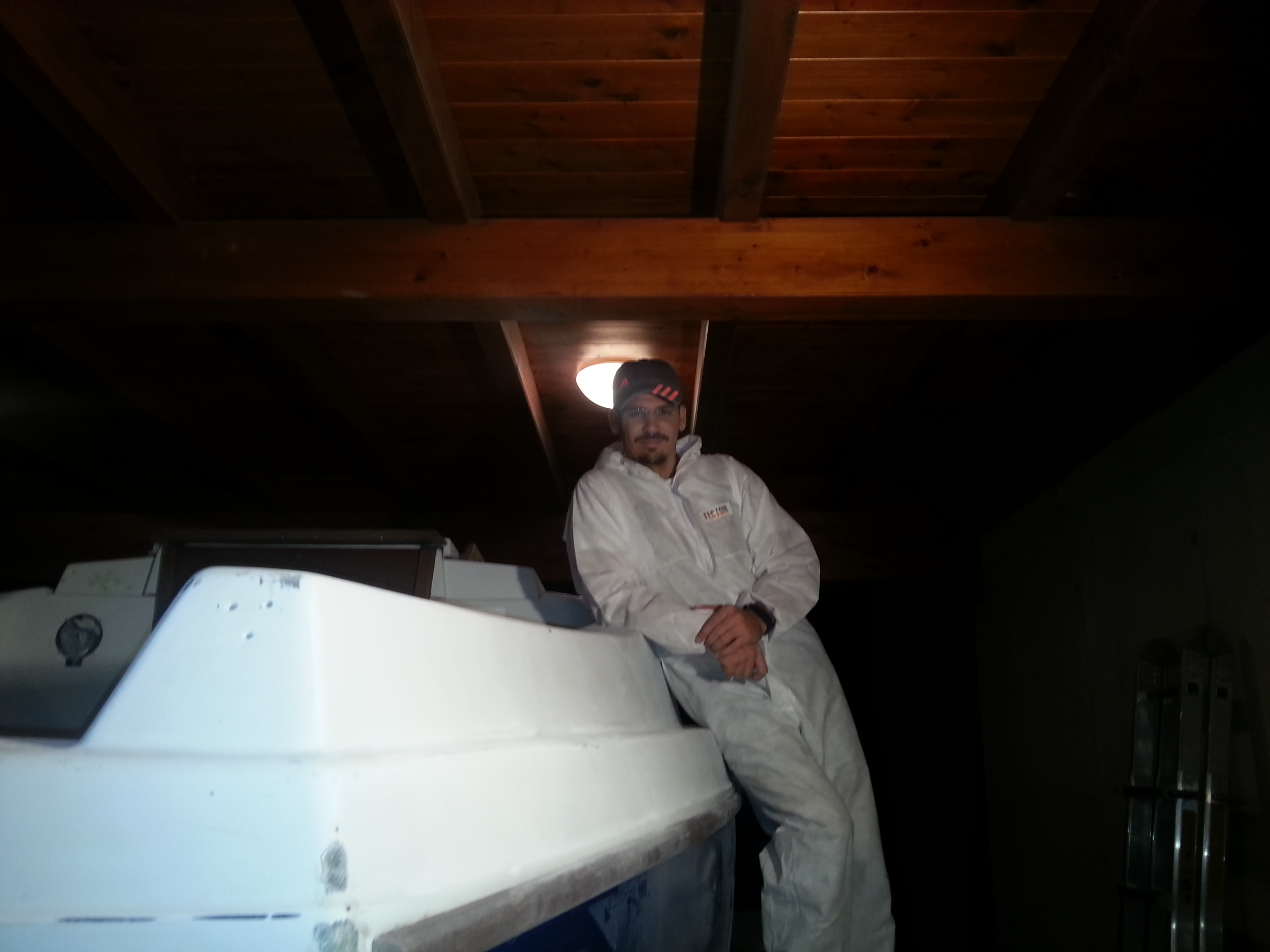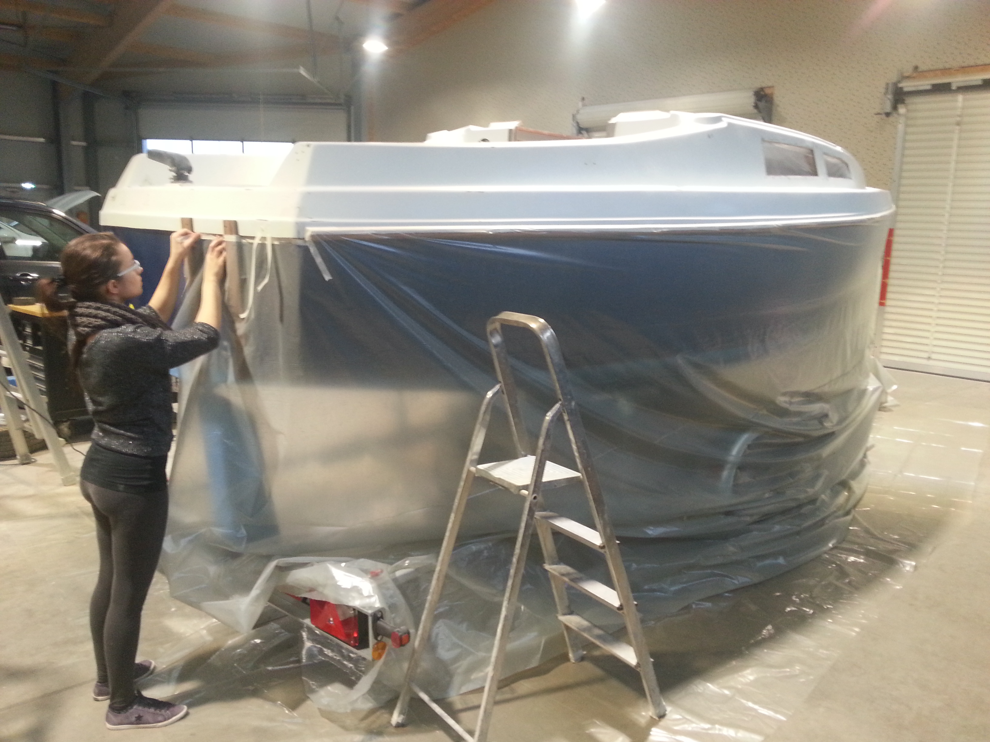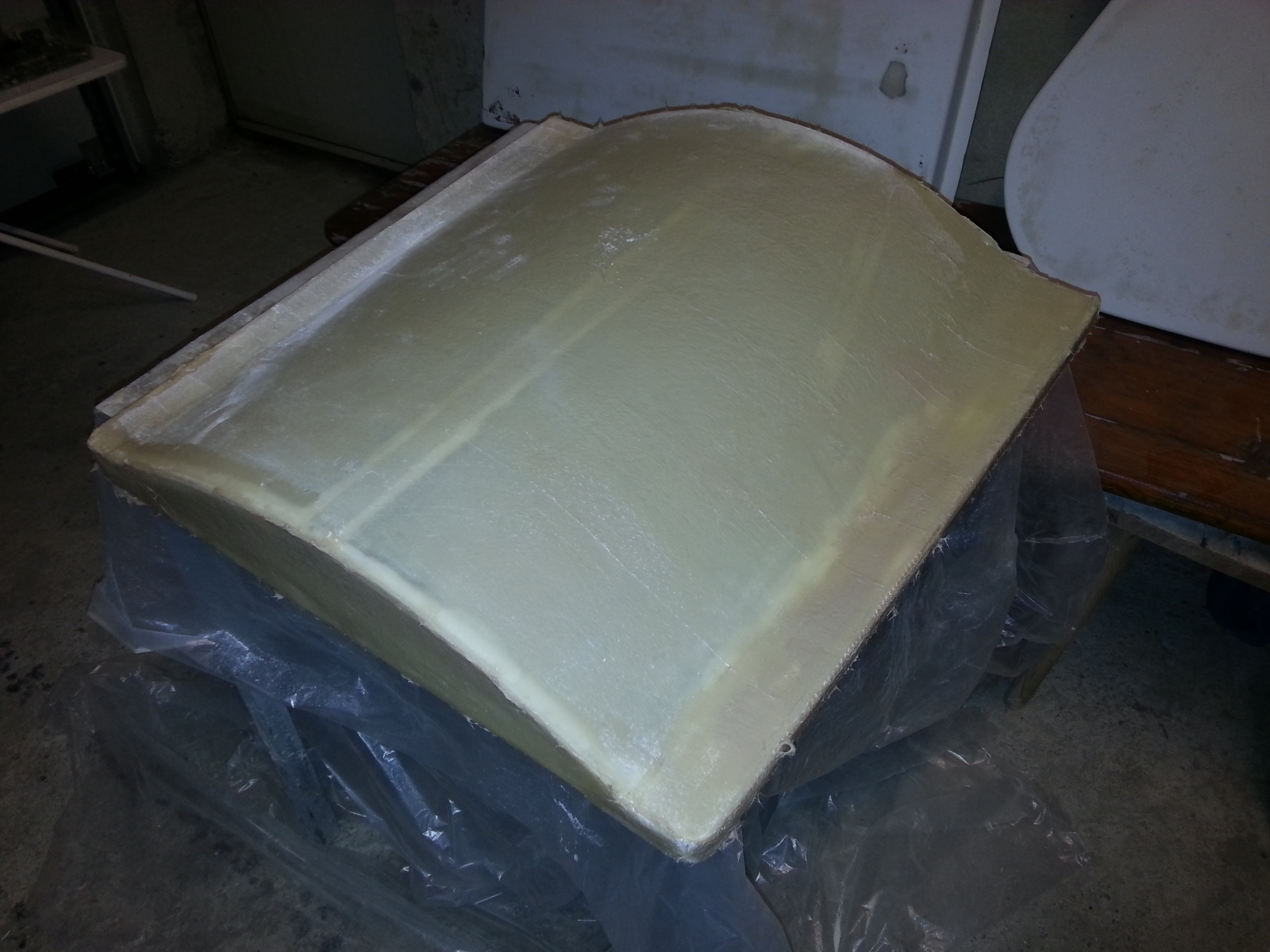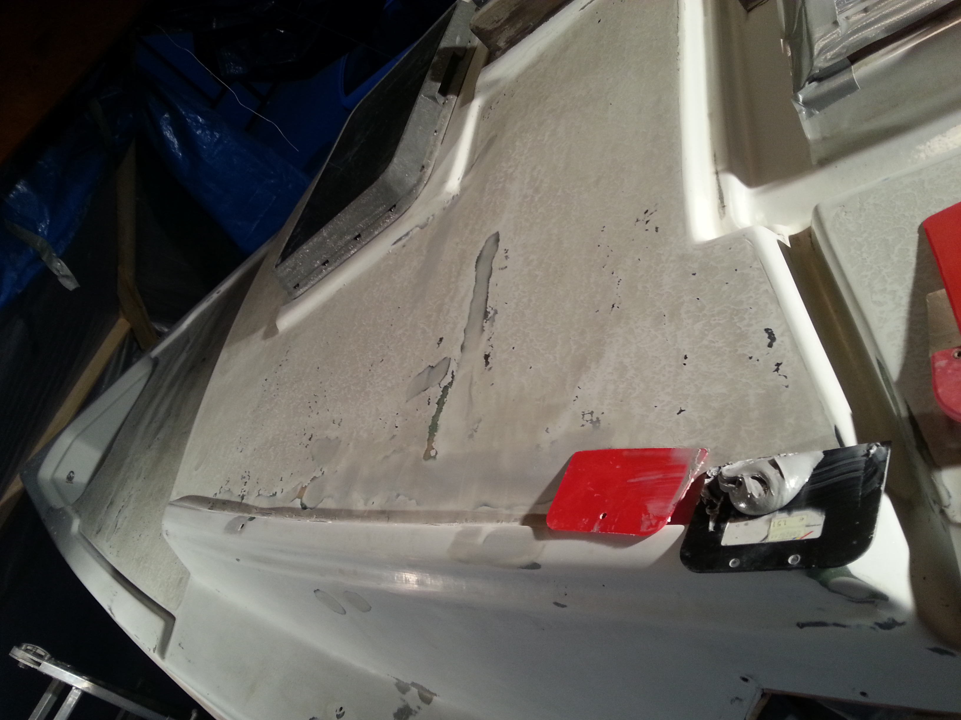 Heute habe ich weitere Schadstellen mit der Flex freigelegt und den Motorschachtdeckel innen mit 1er Schicht Glasfilamentgewebe laminiert
