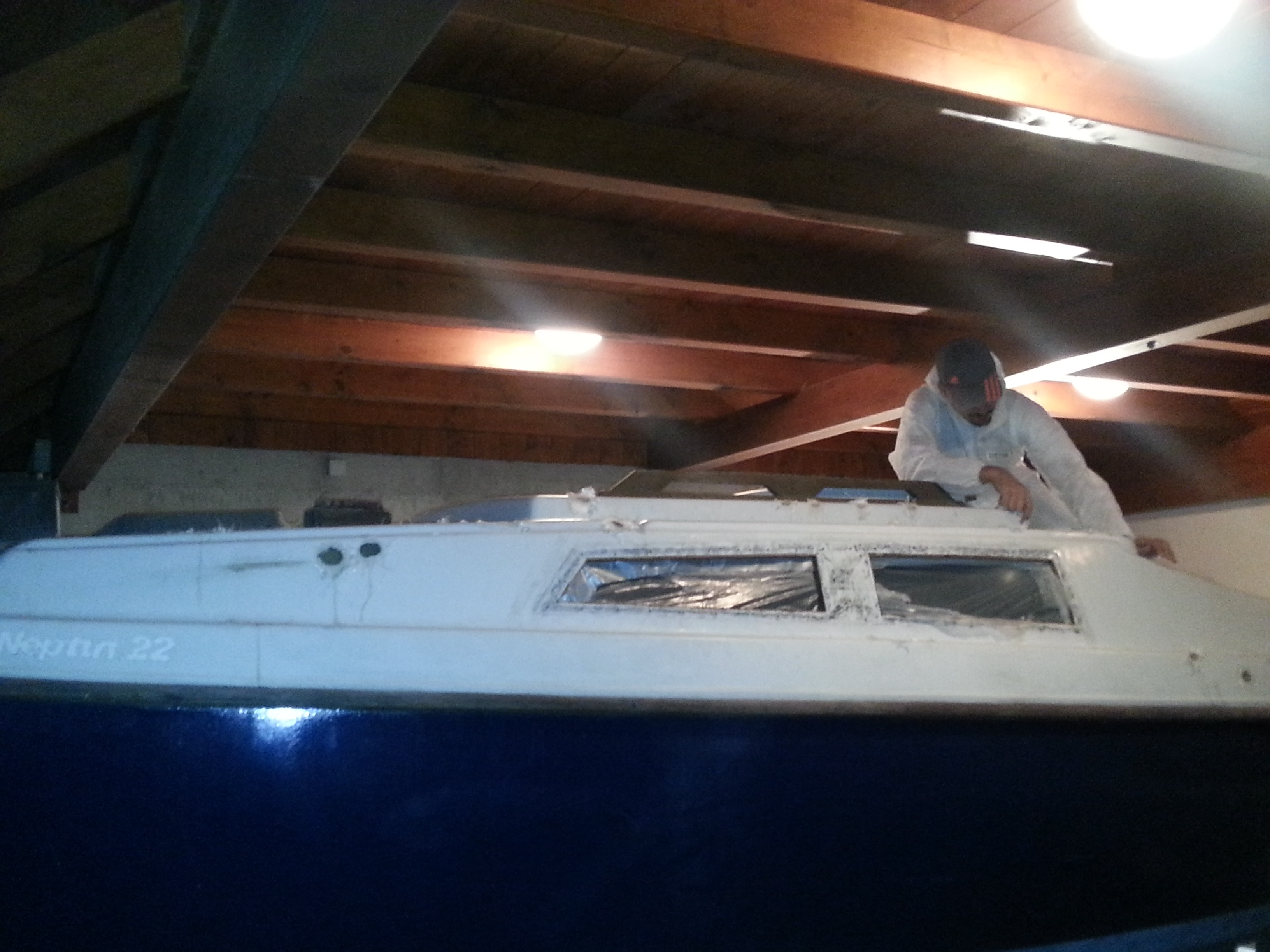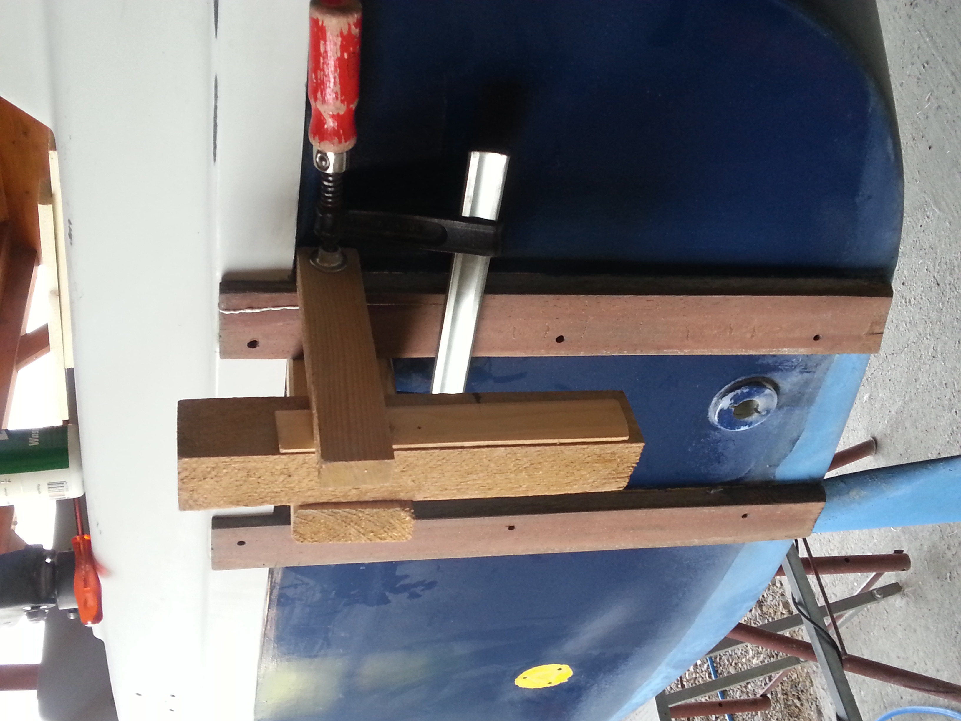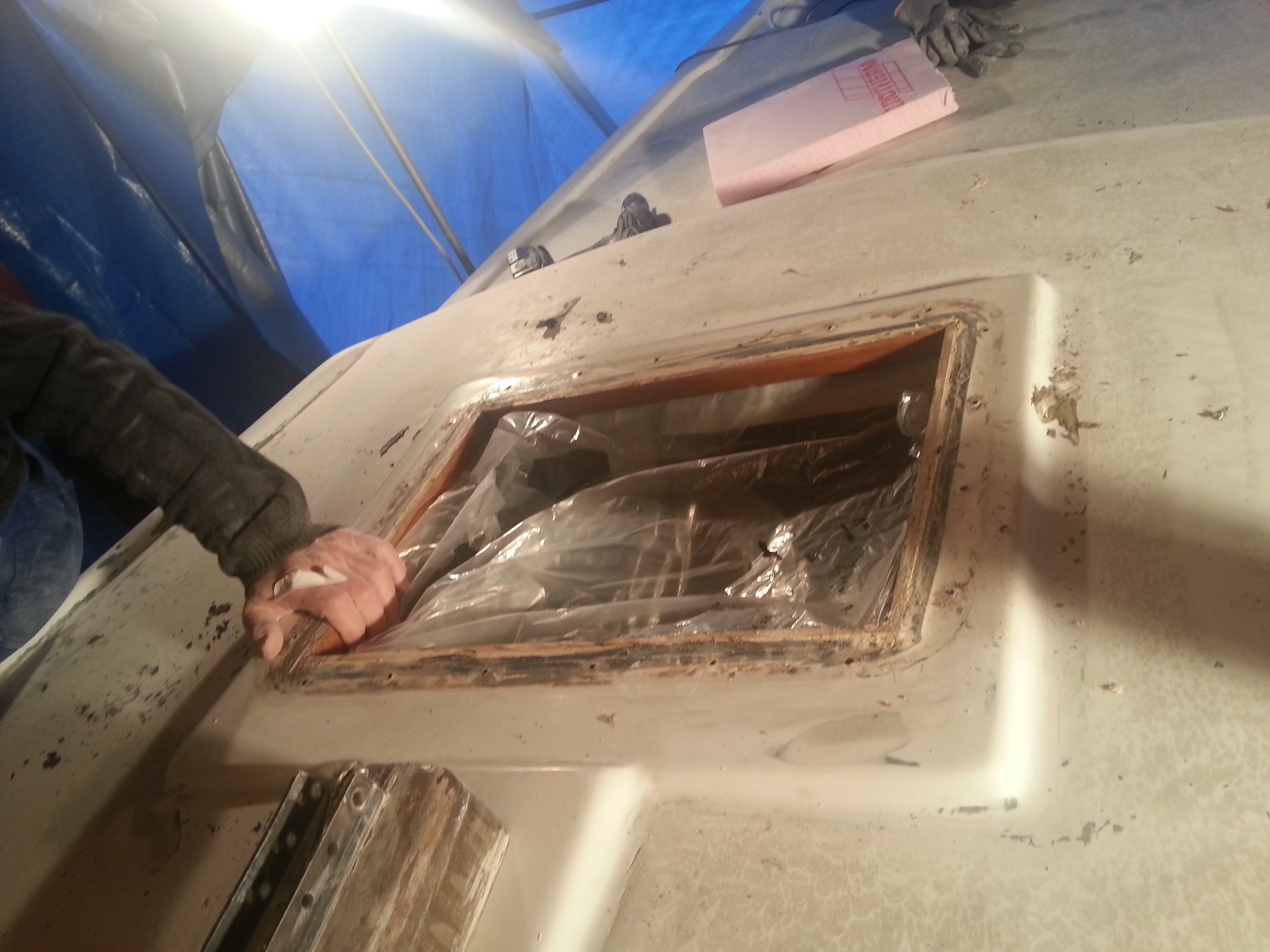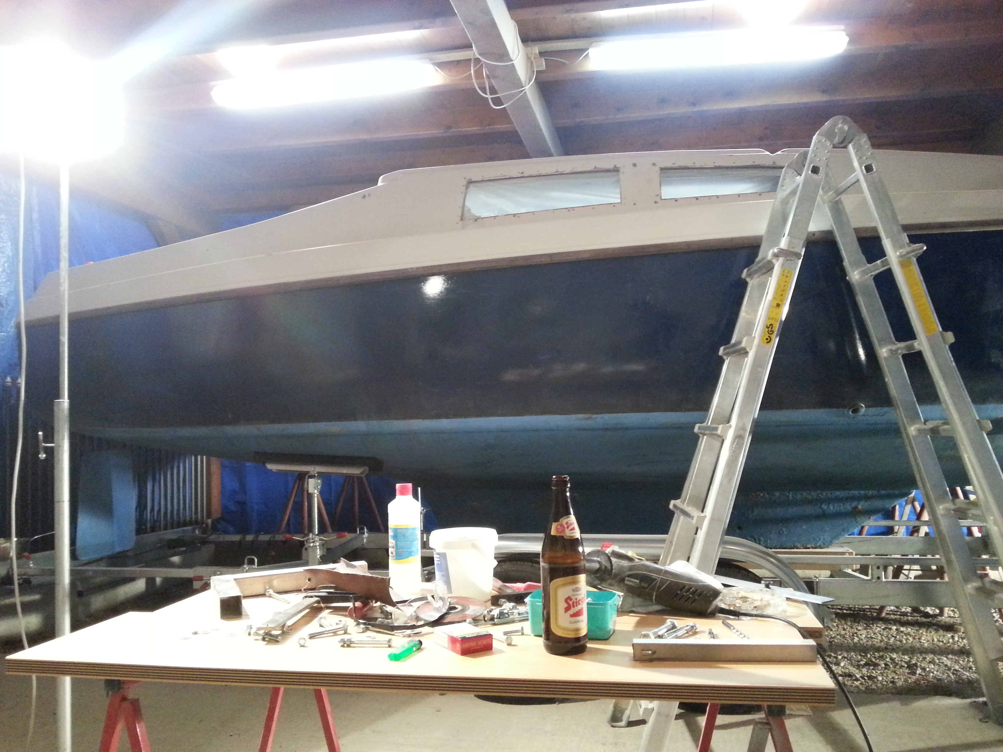 Hänger mittig platzier, aufräumen, Fenster ausbauen, Fockholeschienen abmontiert, Dichtungen entfernt, Motorhalterung-Holzleisten Dichtung entfernt und geschliffen 3x (40/80/120)