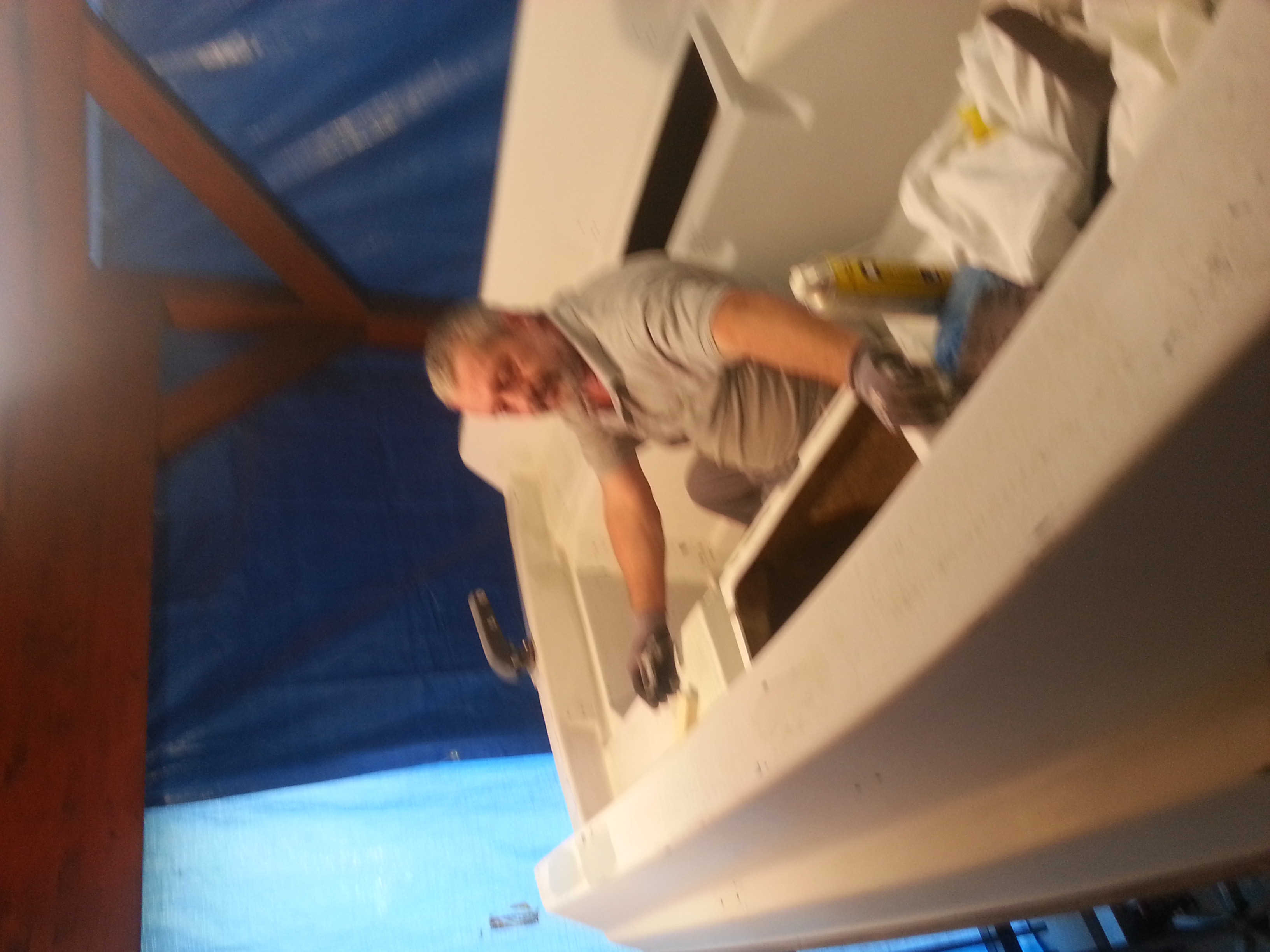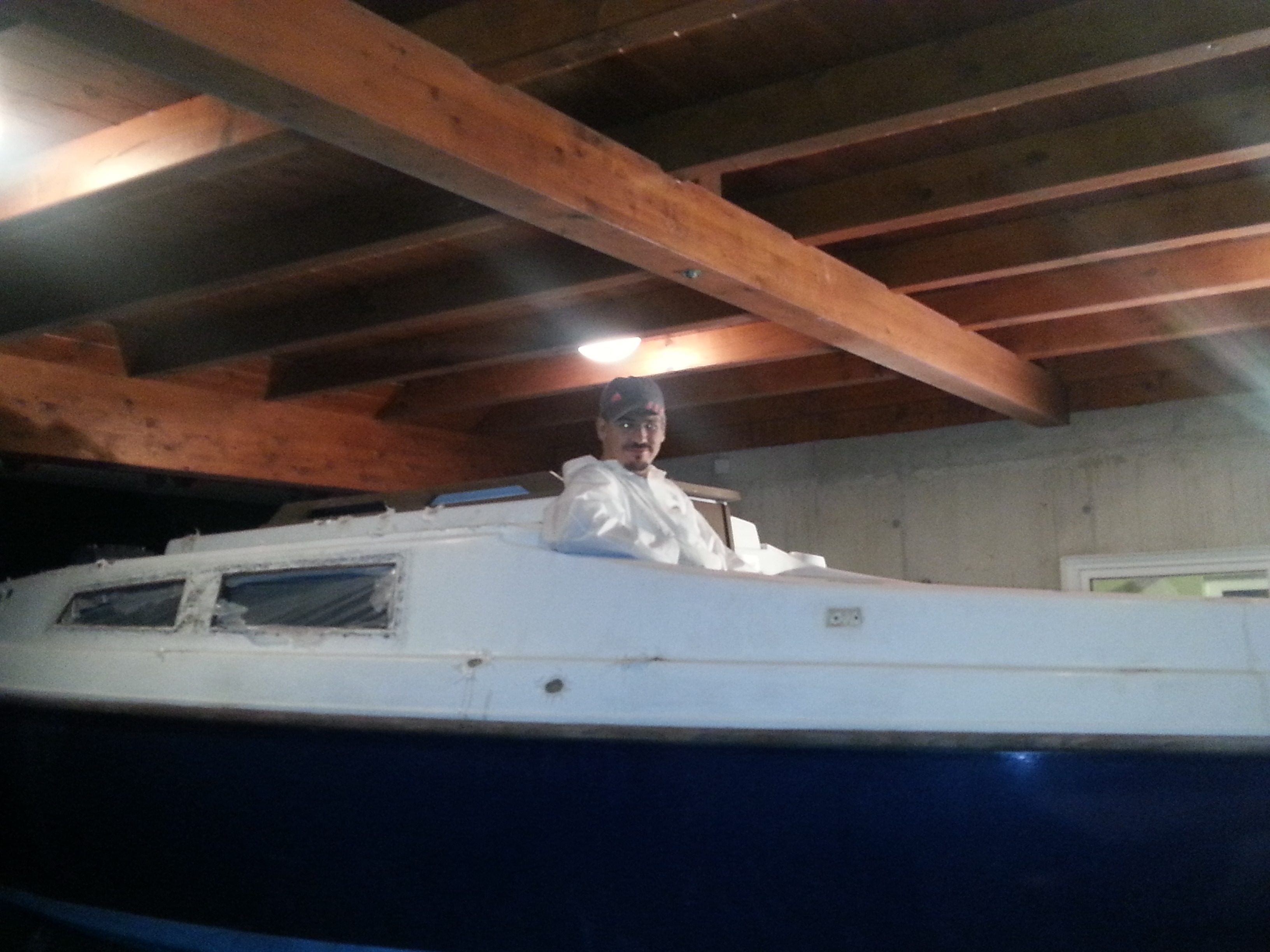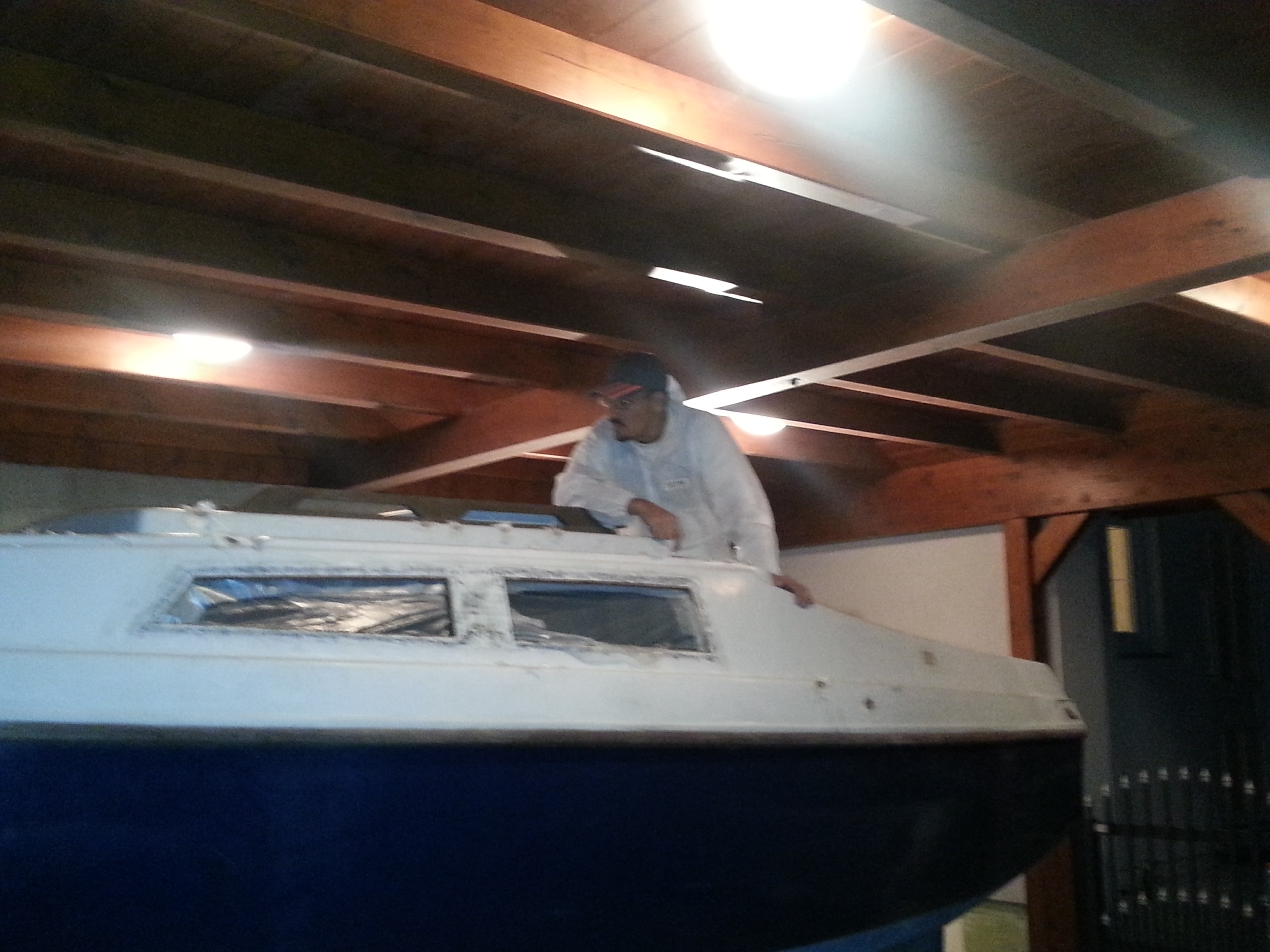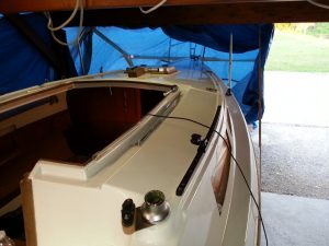 Hänger mittig platzier, aufräumen, Fenster ausbauen, Fockholeschienen abmontiert, Dichtungen entfernt, Motorhalterung-Holzleisten Dichtung entfernt und geschliffen 3x (40/80/120)
