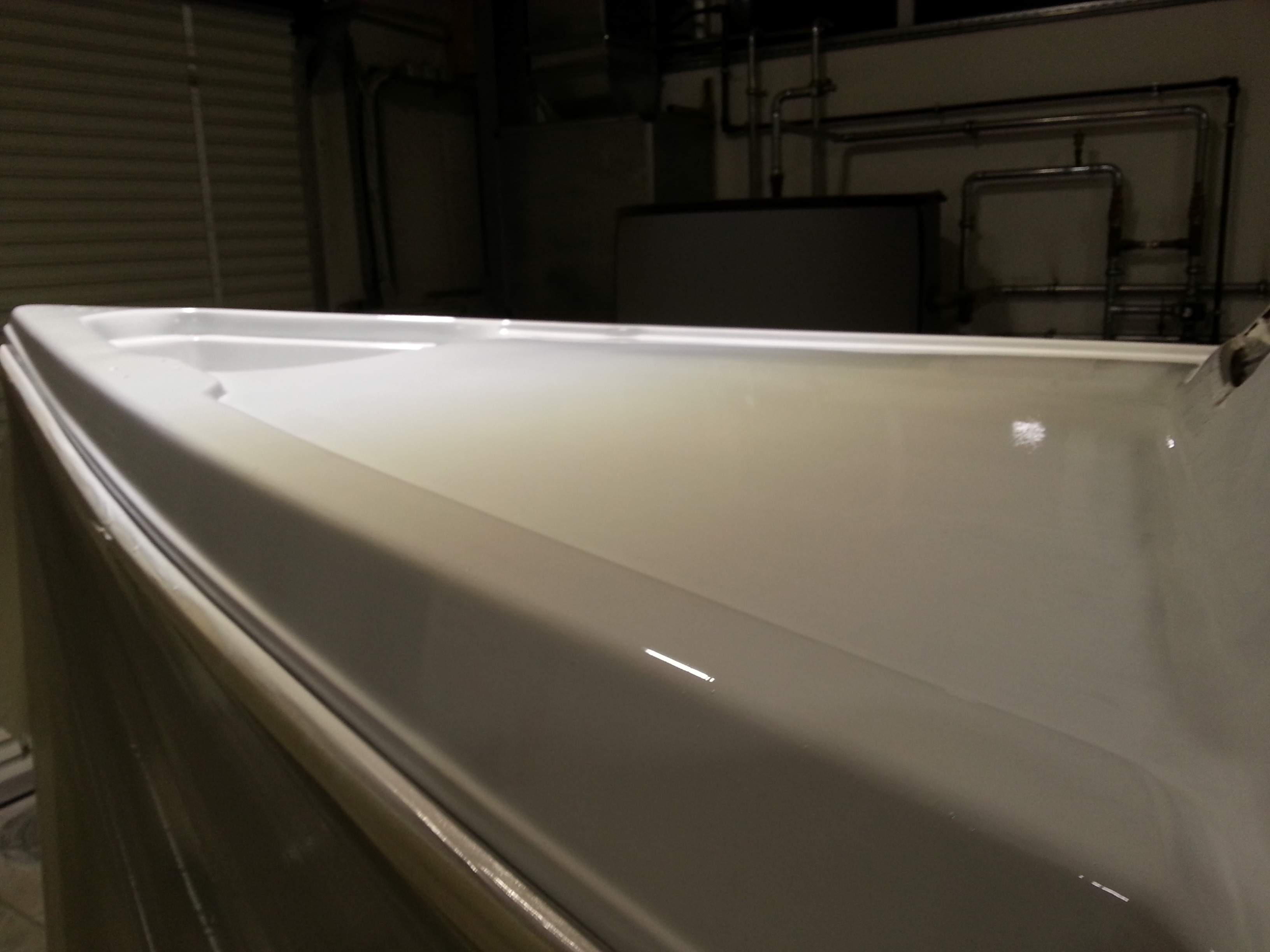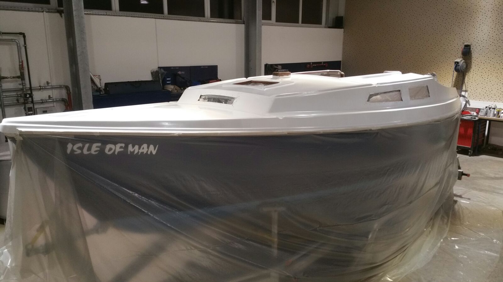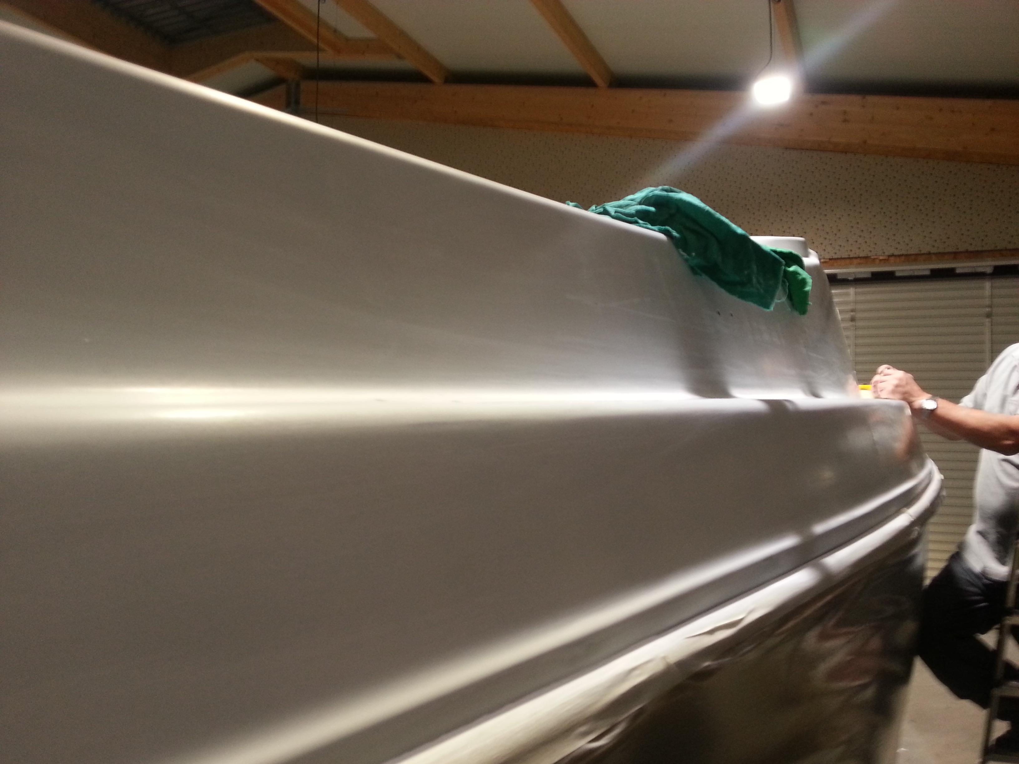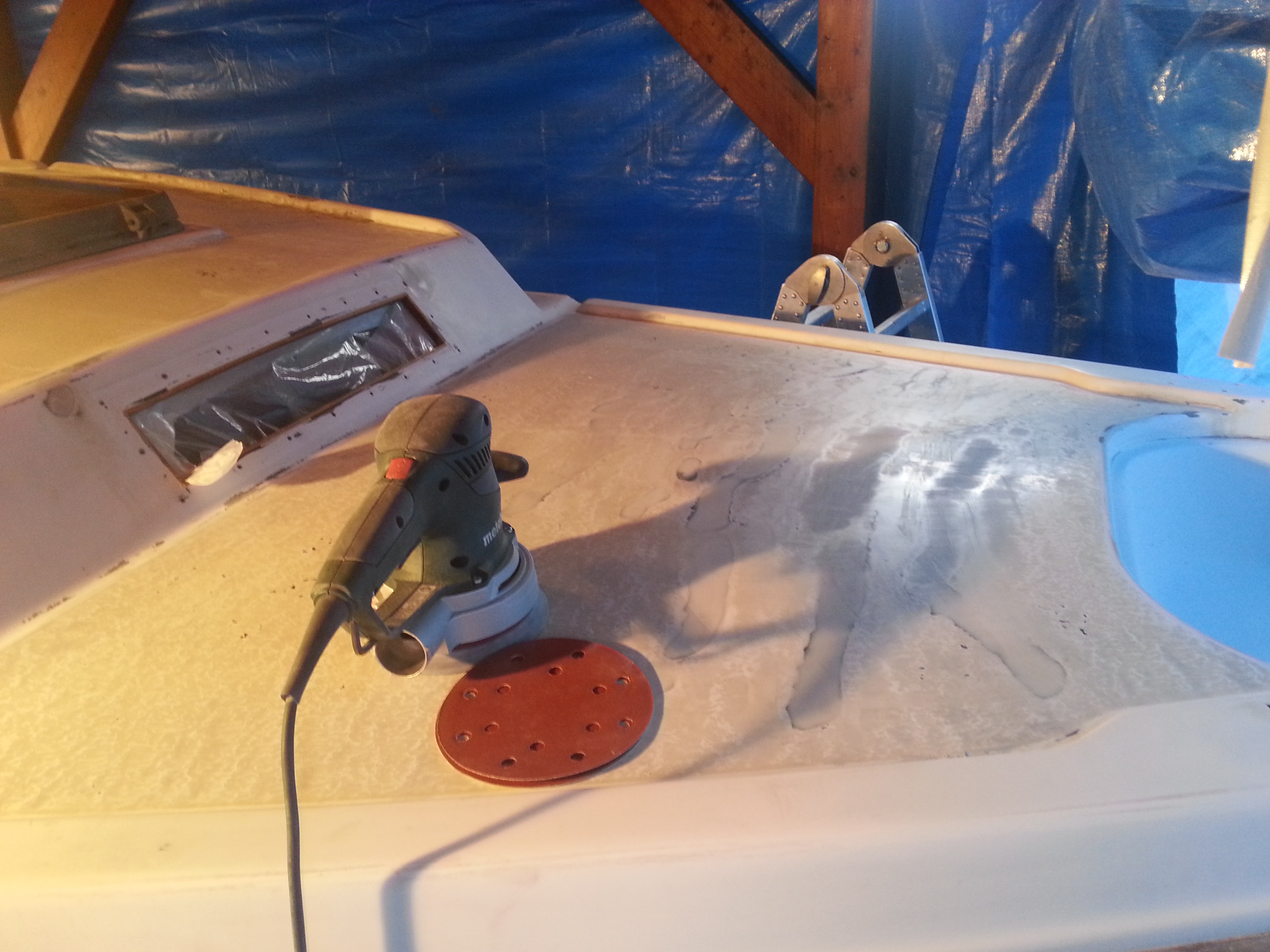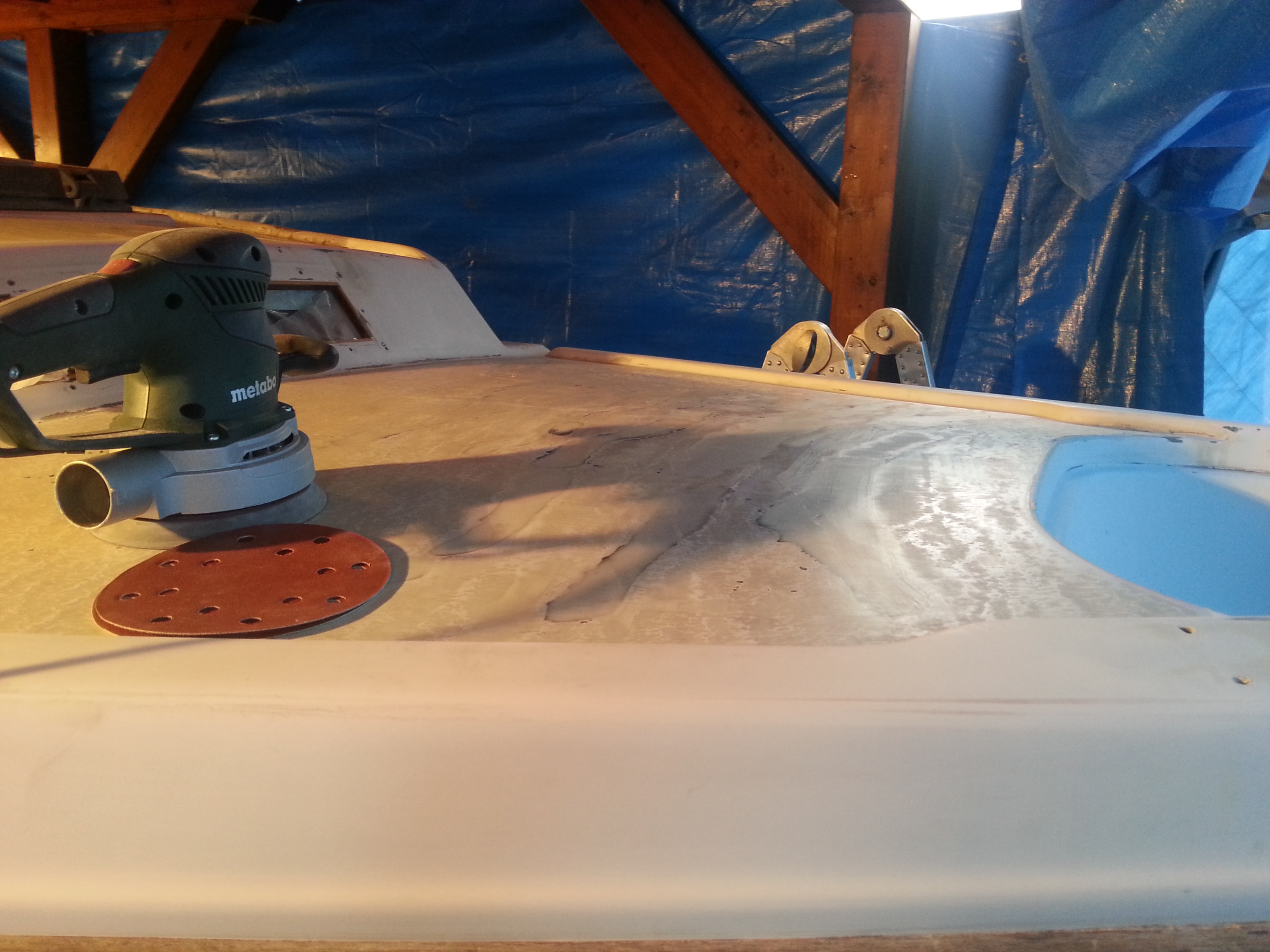 Die groben Schleifarbeiten mit der Maschine sind abgeschlossen. Große Flächen, die ausgebesserten GFK-Stellen sind eben geschliffen.