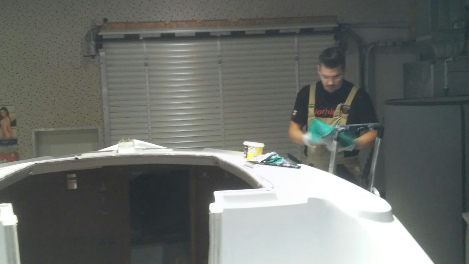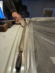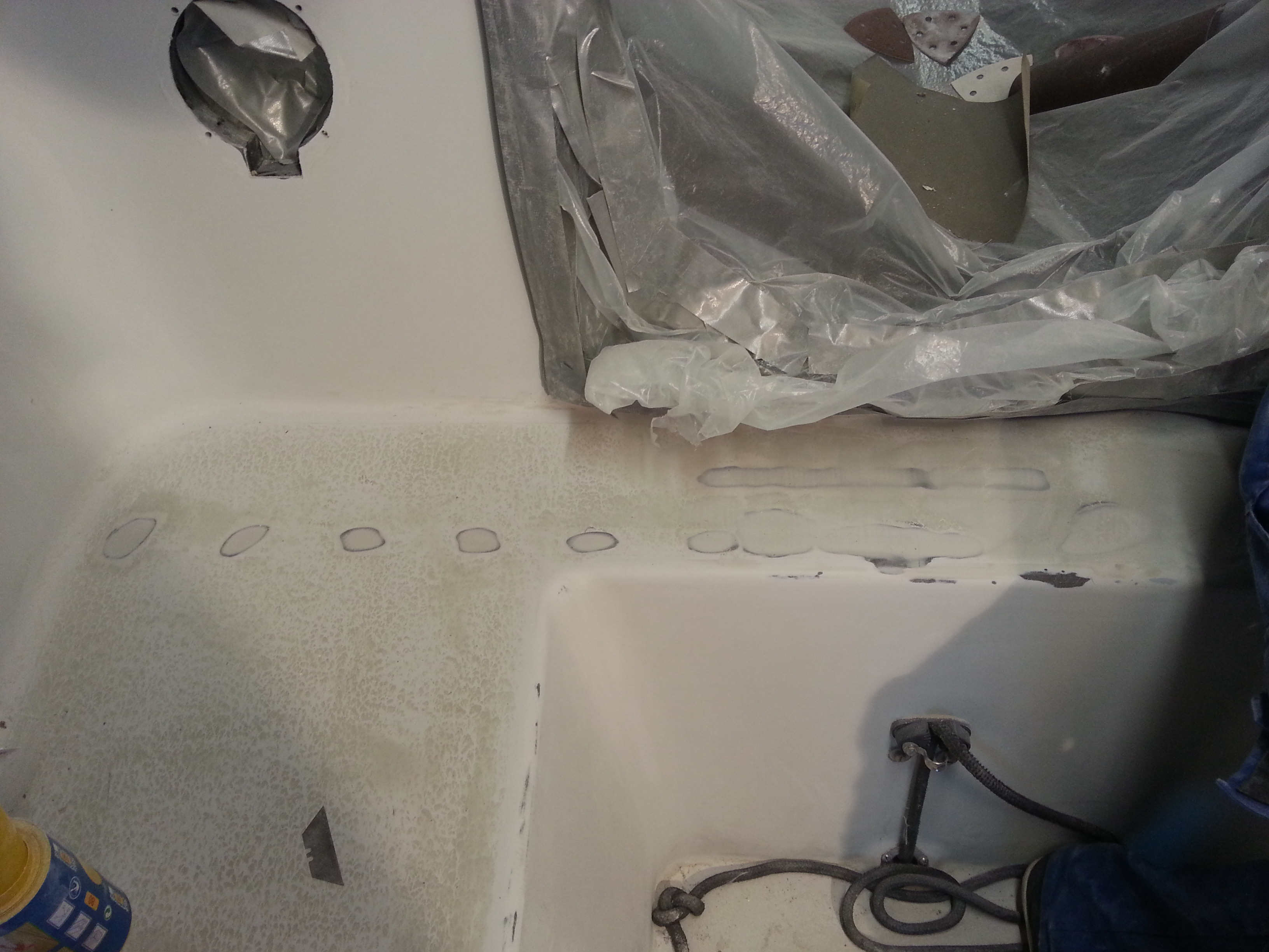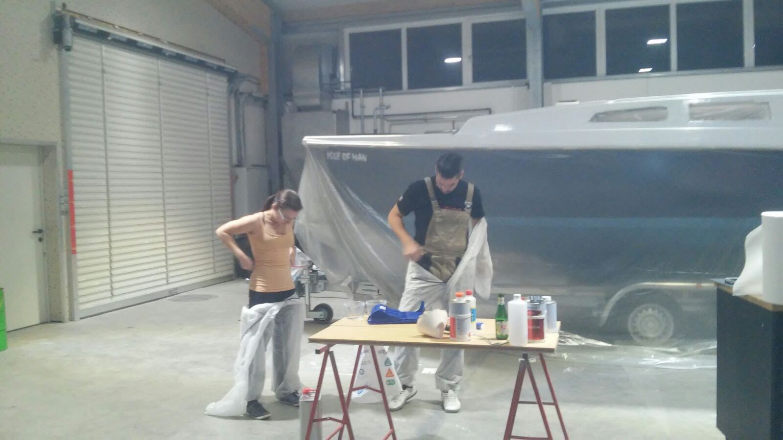 Epoxy ist fast zur Gänze aus, die 3 letzten Schadstellen wurden geöffnet und neu laminiert, dann haben wir den Bereich der zuerst geschliffen wird entfettet und begonnen zu schleifen – ach du Schande ist das mühsam!