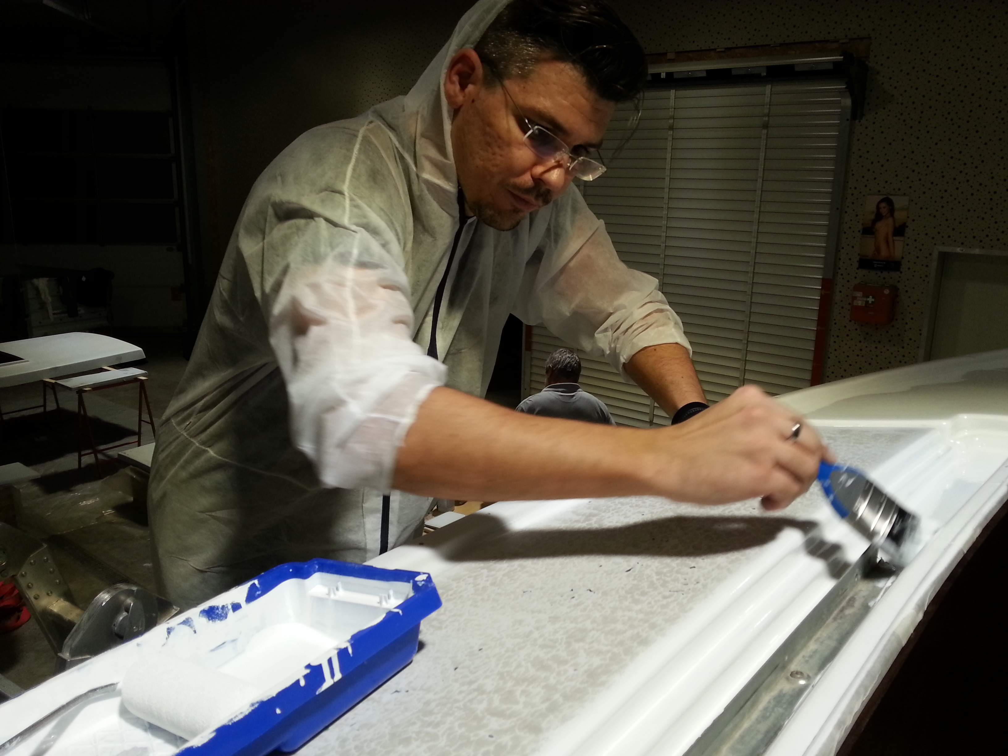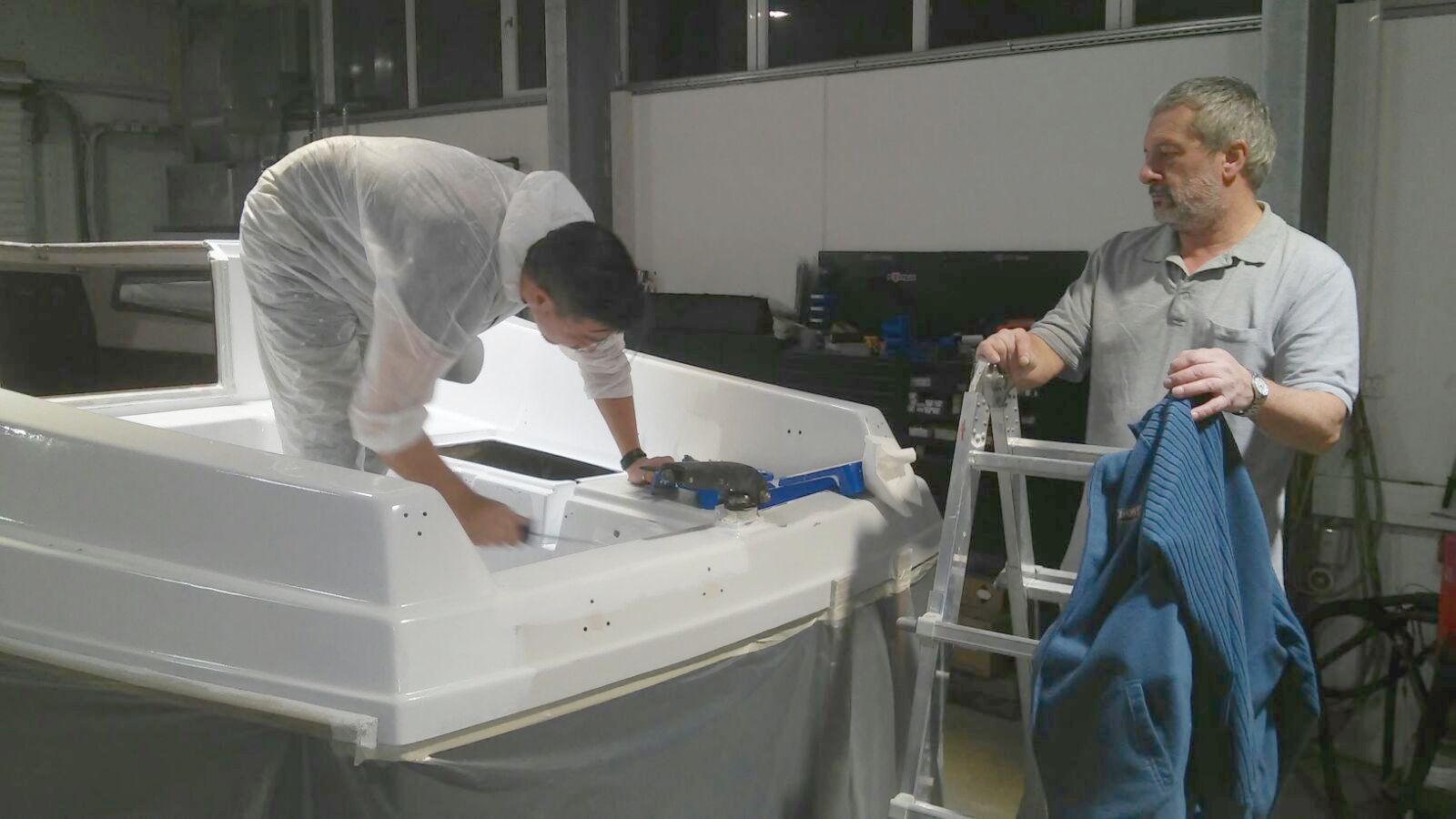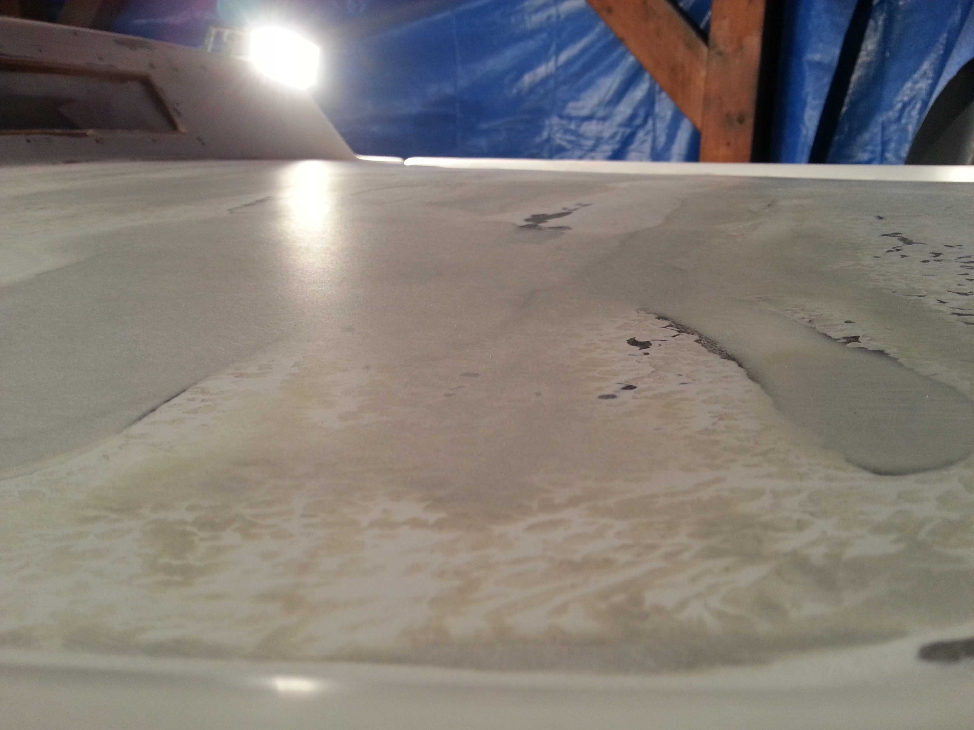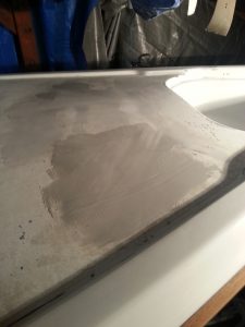 Epoxy ist fast zur Gänze aus, die 3 letzten Schadstellen wurden geöffnet und neu laminiert, dann haben wir den Bereich der zuerst geschliffen wird entfettet und begonnen zu schleifen – ach du Schande ist das mühsam!