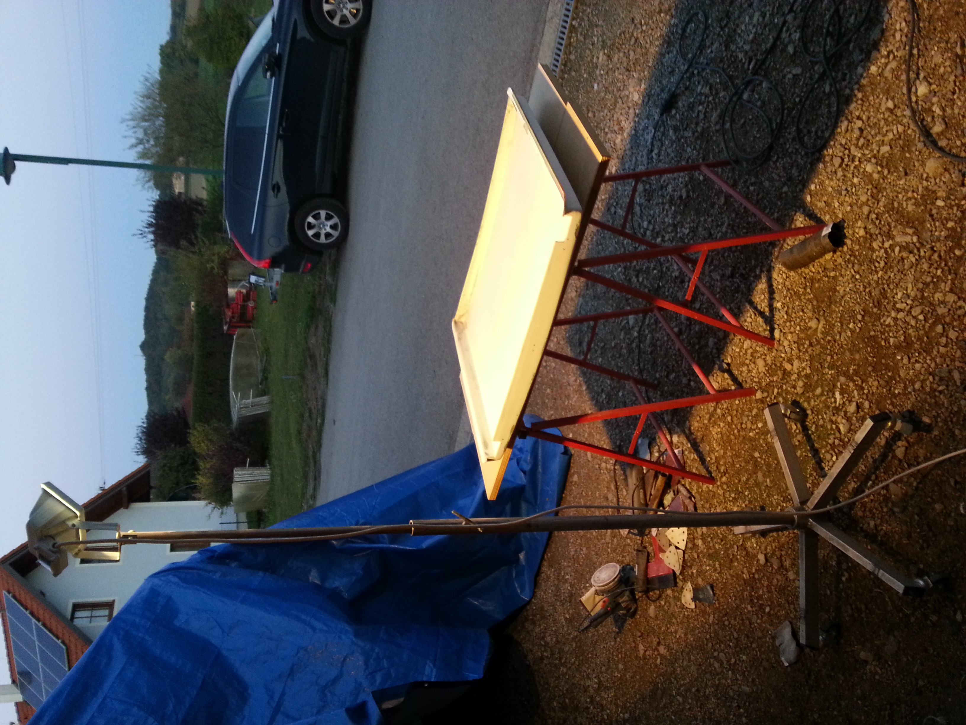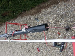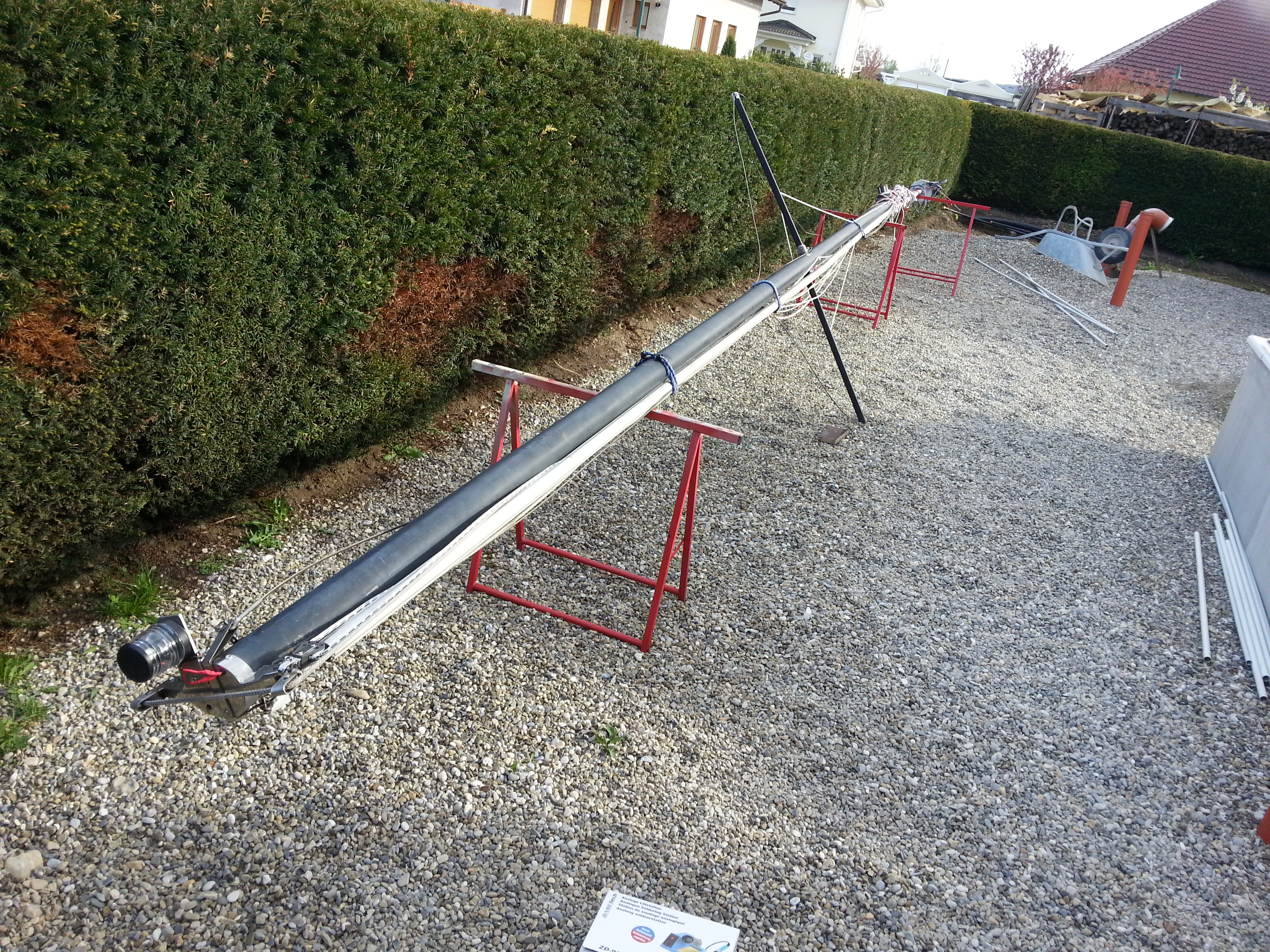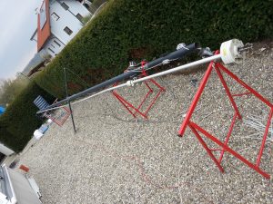Wir haben das Gespann dazu auf Nachbars Grundstück gestellt (natürlich mit Erlaubnis 🙂 ) und dort alles vorbereitet. Danach wurde der Mast ausgepackt und mit der vorhandenen