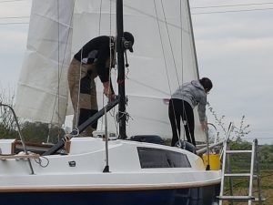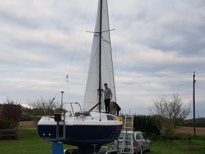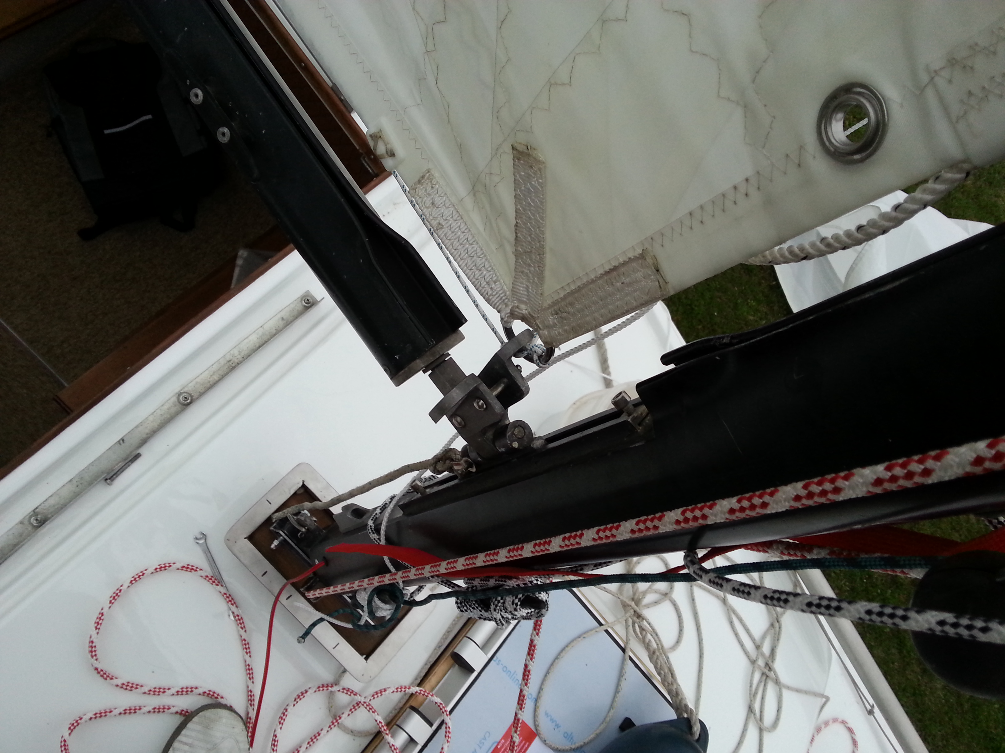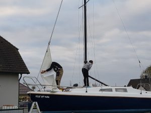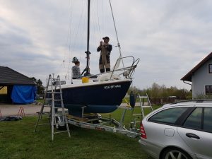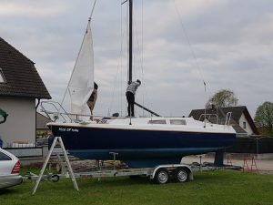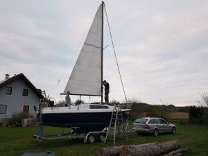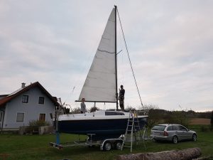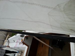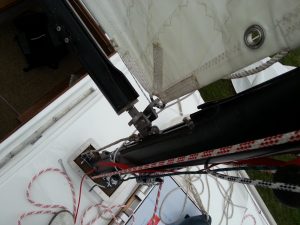 Dann haben wir den Baum montiert, Gross und Vorsegel montiert. Soweit alles gut – leider hat der Fallschlitten ein Problem (Kugellager und Freigängigkeit sind praktisch nicht mehr vorhanden) deshalb wird dieser neu bestellt (kostet 75€ bei BUKH Bremen).